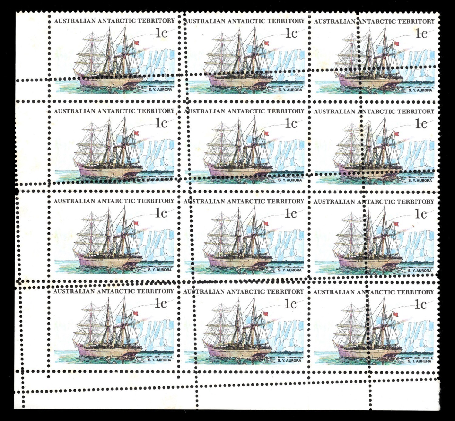 AUSTRALIAN ANTARCTIC TERRITORY: 1980 (SG.37) 1c S.Y. Aurora, lower left corner blk.(12) with dramatic horizontal and vertical