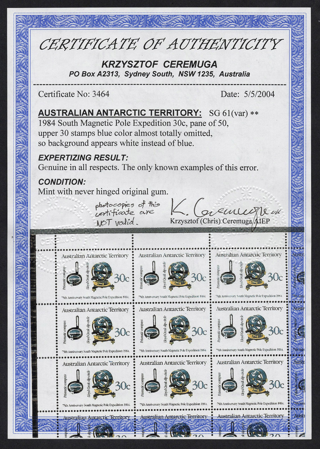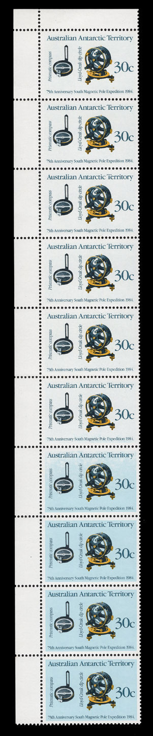 AUSTRALIAN ANTARCTIC TERRITORY: 1984 (SG.61 variety) 30c South Magnetic Pole Expedition, upper left corner marginal vertical
