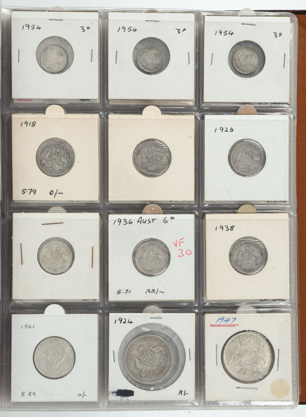 An accumulation of pre-decimal coins, mainly Threepences, Sixpences, Shillings and Florins, in plastic sleeves and a couple of