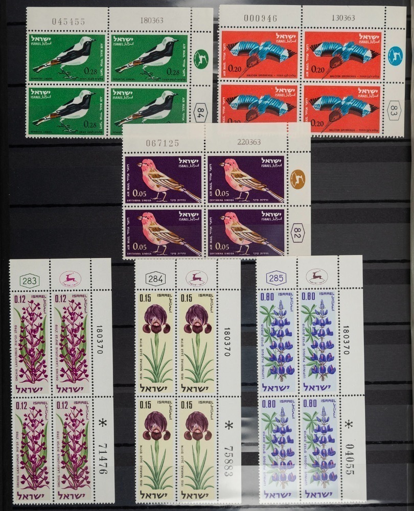 Flag tab singles (2), Petach Tikva tab singles (2), 1949 New Year tab set, 1949 UPU tab set and tete-beche gutter pairs, 1950 Independence pair, 1950 1st Air Mails, 500pr Negev Camel, 1951 JNF, 1952 Menorah, 1953 Air Mails complete, and most later