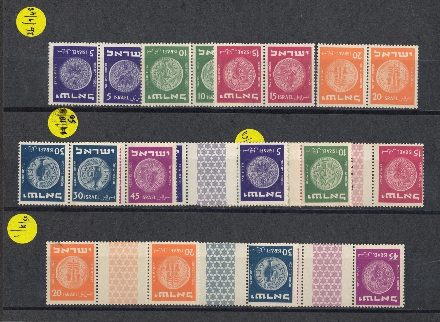 tete-beche pairs, Tabul M/S, 1949 Flag tab singles (2), Petach Tikva tab singles (2), 1949 New Year set of three, 1950 2nd Postage Dues, UPU Issues with tete-beche and se tenant pairs, 1950 2nd Independence pair, 1st Air Mails, Negev Camel, 1951 JNF,