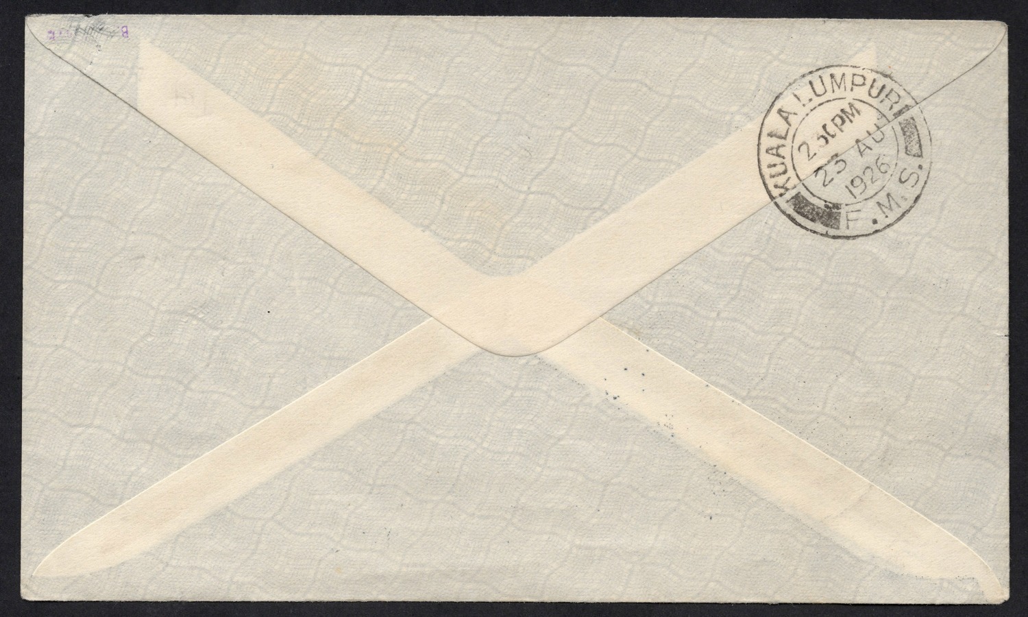 23 August 1926 Singapore to Kuala Lumpur Experimental flight cover; with arrival backstamp. (Image 1)