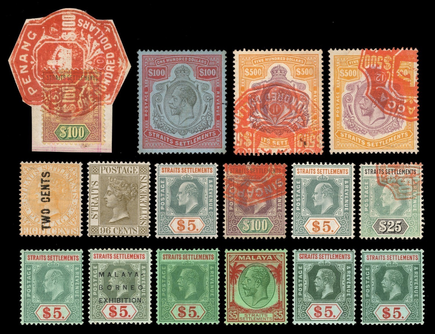 the $25 and $100 with fiscal cancels, the 3rd Edward VII series to $5 Mint plus a $5 Specimen, $25 fiscal and $500 fiscal, KGV to $5 (4) Mint plus $25, $100 & $500 fiscals, Malaya - Borneo Exhibition Opts to $5 Mint, and a good range of the