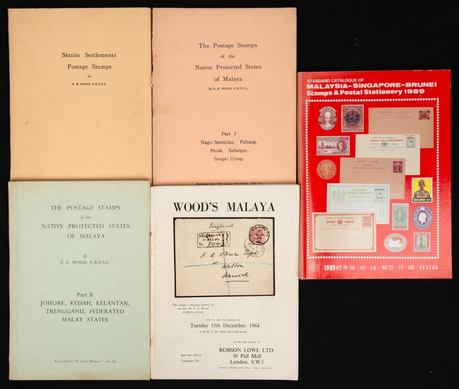 States of Malaya Vols.1 & 2" by Wood; "Wood's Malaya" Dec.1964 Robson Lowe auction catalogue & 1989 Malaysia-Singapore-Brunei catalogue. (5 items). (Image 1)