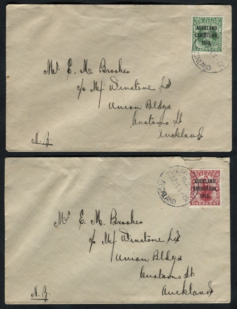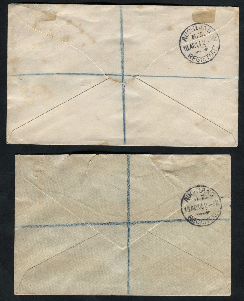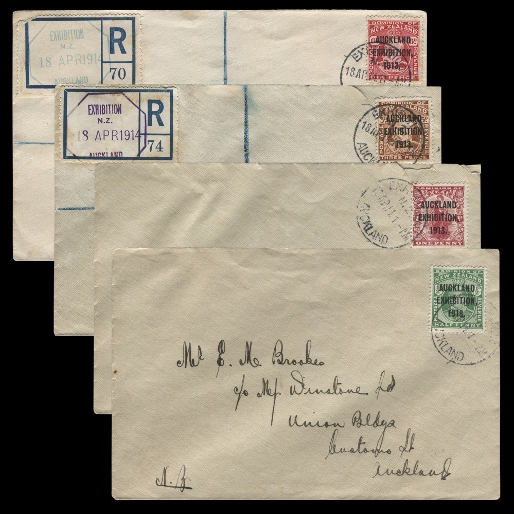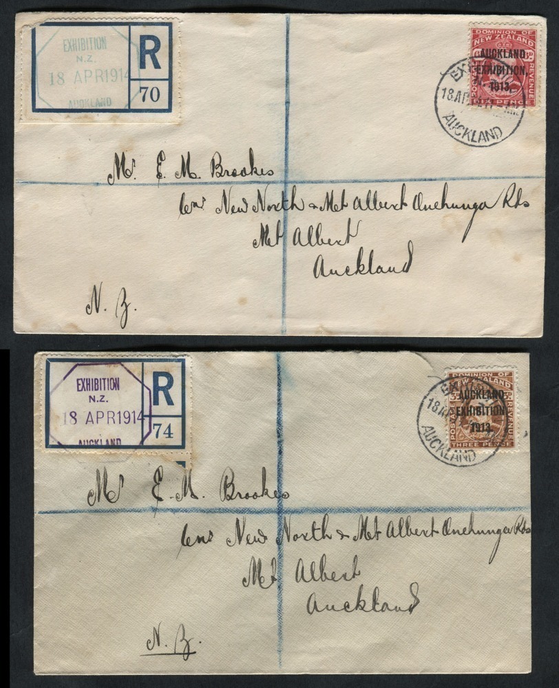 'EXHIBITION/NZ/18AP14/AUCKLAND' cds, the 3d & 6d covers also with octagonal 'EXHIBITION/NZ/18APR1914/AUCKLAND d/s in violet (rare) or green on affixed registration labels and both with Auckland arrival b/stamps. A difficult to