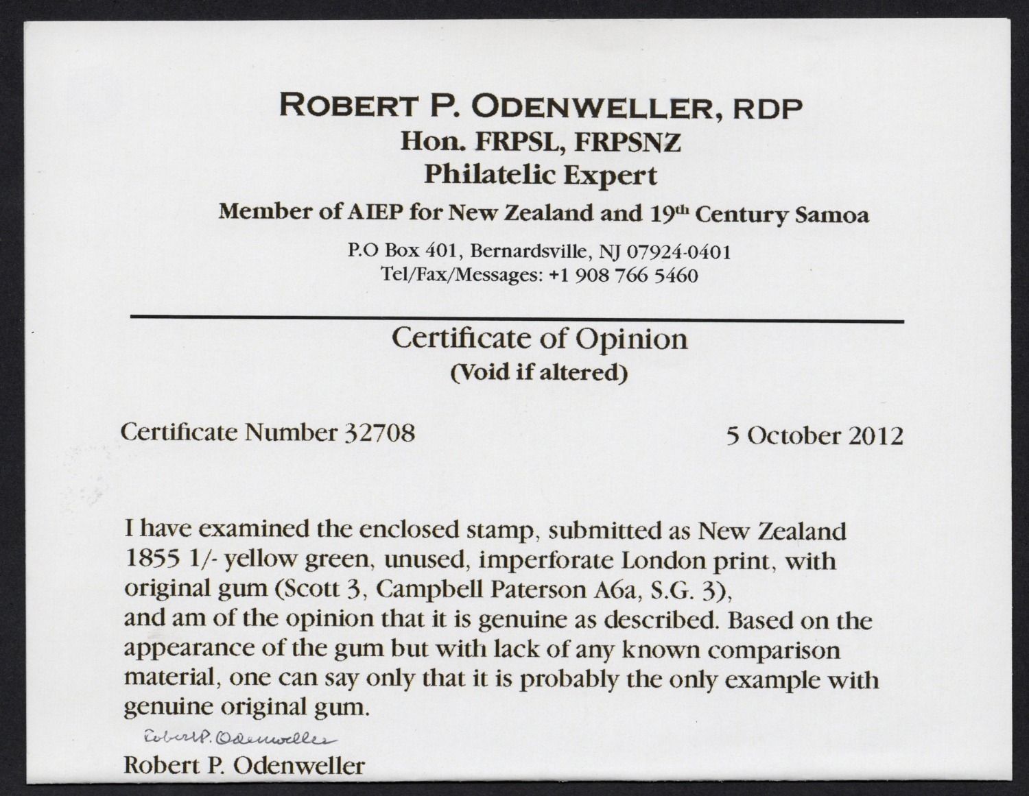 accompanying Odenweller [2012] Certificate of authenticity as "probably the only example with genuine original gum.". Cat.£60,000. An exceptional classic stamp of New Zealand.