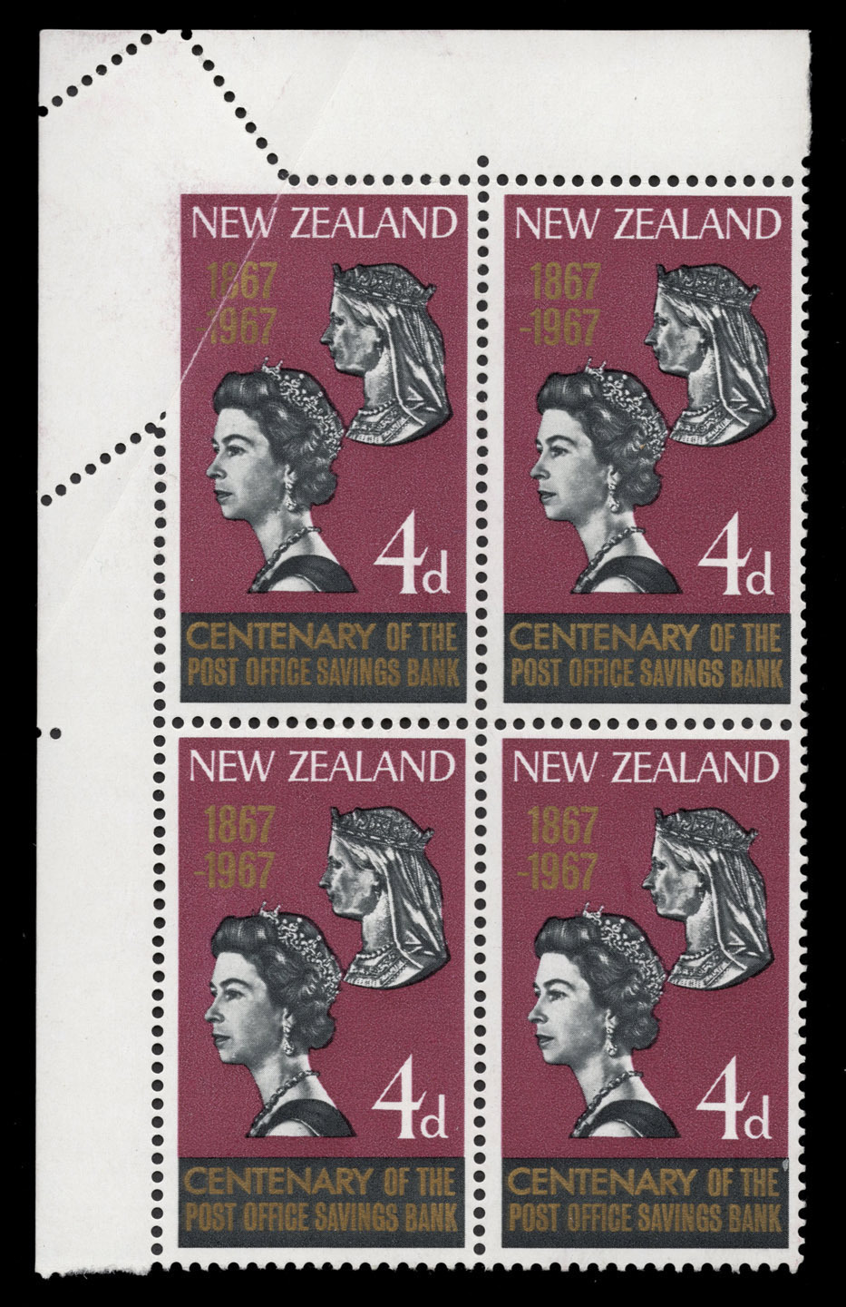 1967 (SG.843 var.) 4d Post Office Savings Bank, upper left corner blk.(4) , the corner unit partially IMPERFORATE as a result of a