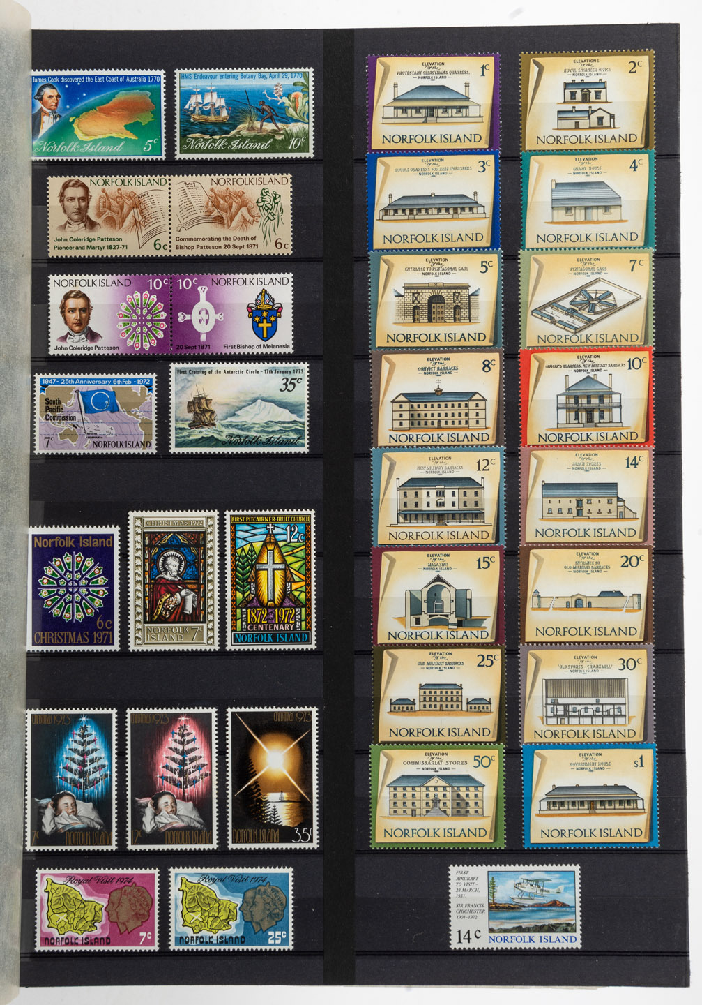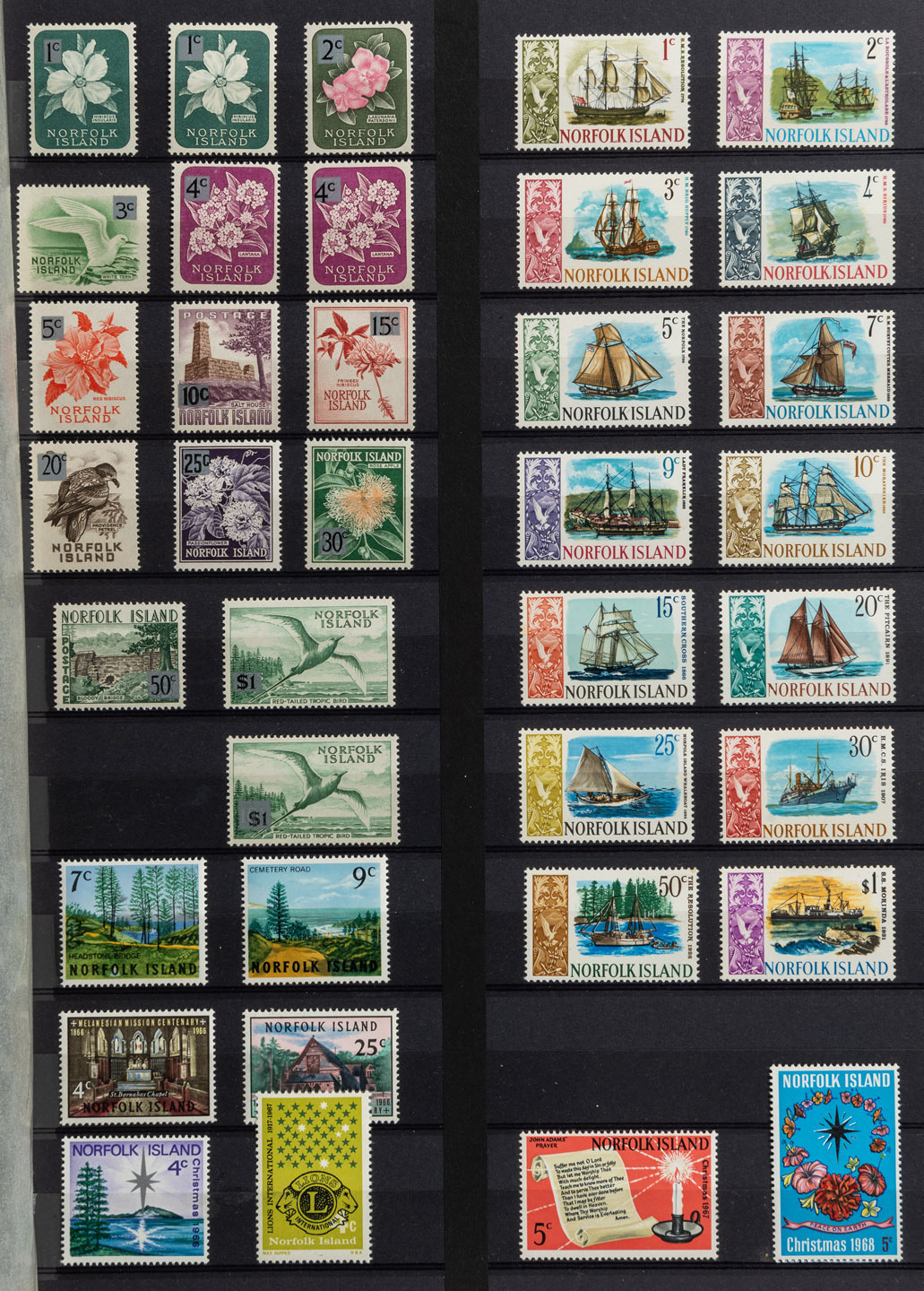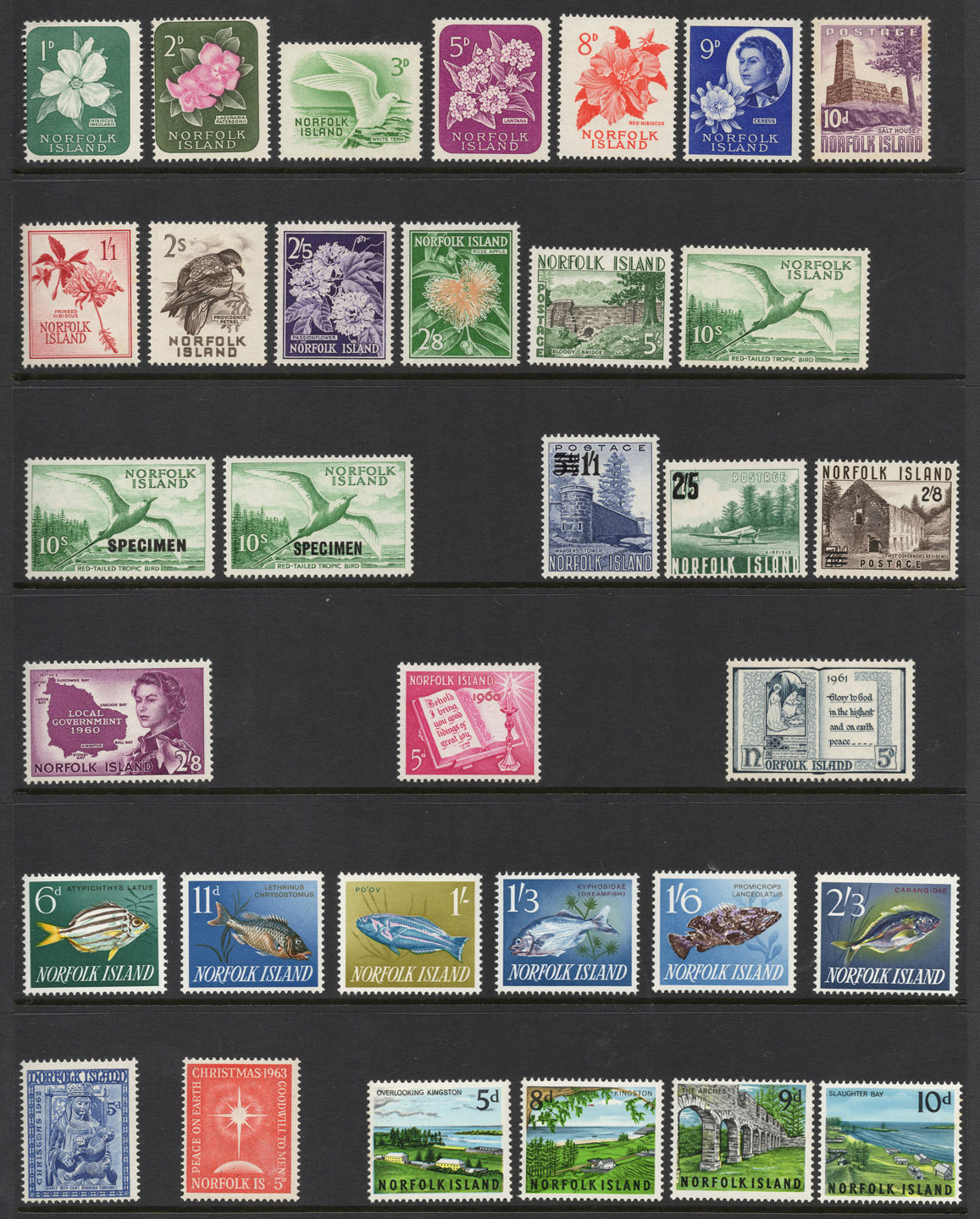 (incl. the White papers, Cat. £170+), 1953 Pictorials to 5/- Brown, 10/- Tropic Bird SPECIMEN Overprints (3 different settings), etc, all MUH. Also a cover front bearing KGV ½d Green pair tied by fine strikes of the NORFOLK ISLAND 16AU18