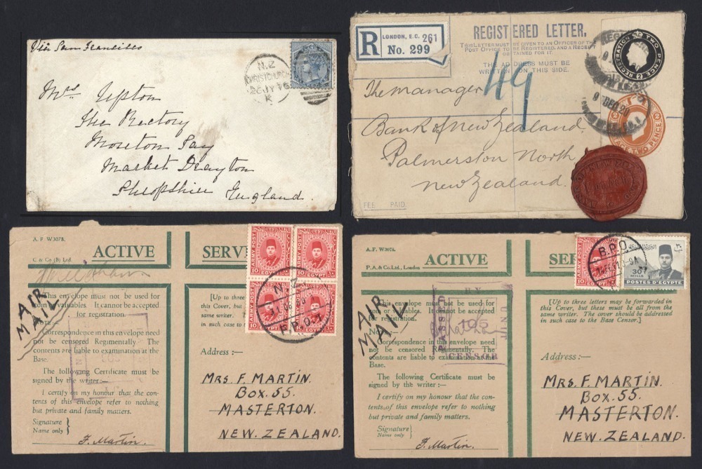 postcards, a 1920 incoming 2d KGV Registration Envelope from London to Palmerston North, and two N.Z. Active Service Envelopes from Egypt to Masterton with Army Post frankings. (9 items). (Image 1)