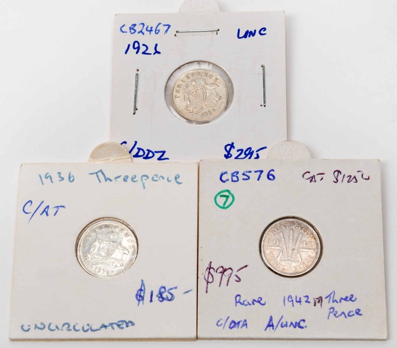 THREEPENCES: GEORGE V 1926 EF, 1936 Unc, and 1942 (Melb.) VF+. (3 coins). (Image 1)