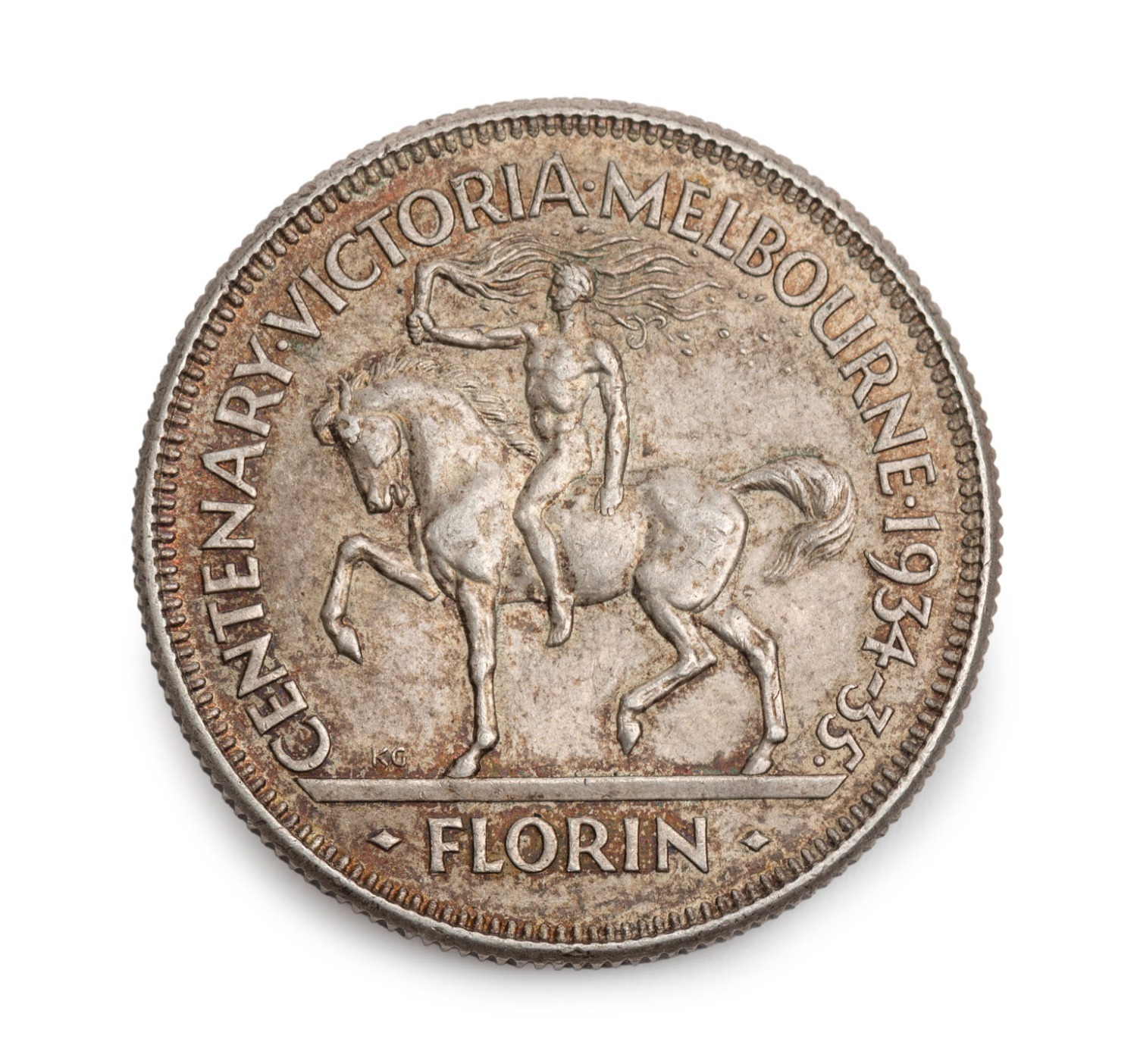 1934-35 Melbourne Centenary florin, together with an original Foy & Gibson bag, VF. (Image 1)
