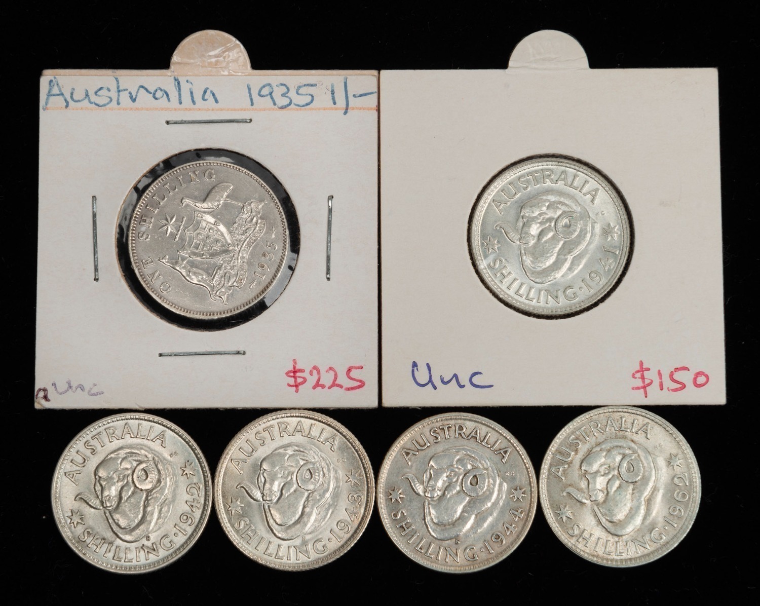 SHILLINGS: 1935 EF, 1941 aUnc, 1942S EF, 1943S aUnc, 1944S VF, and 1962 aUnc. (Total: 6). (Image 1)