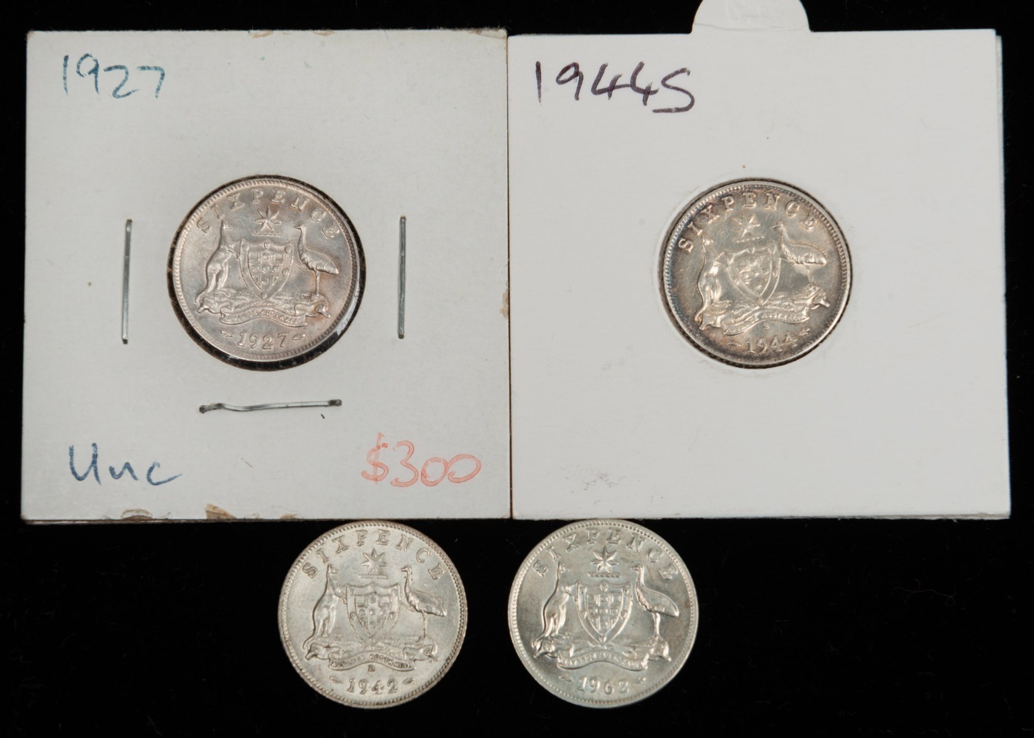 SIXPENCES: 1927 Unc, 1942D EF, 1944S EF and 1962 Unc. (Total: 4). (Image 1)