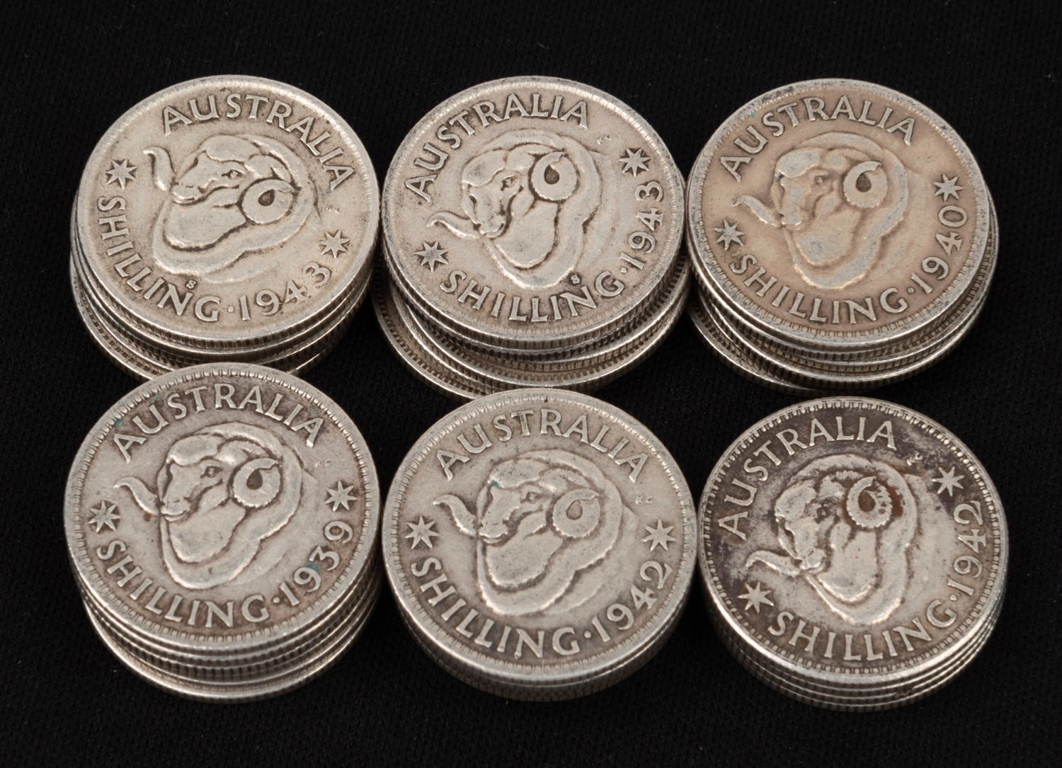 SHILLINGS: GEORGE VI, 1938 (2), 1939 (2), 1940 (1), 1941 (4), 1942 (6), 1943 (13), 1944 (6); mixed condition. (Total: 34) (Image 1)