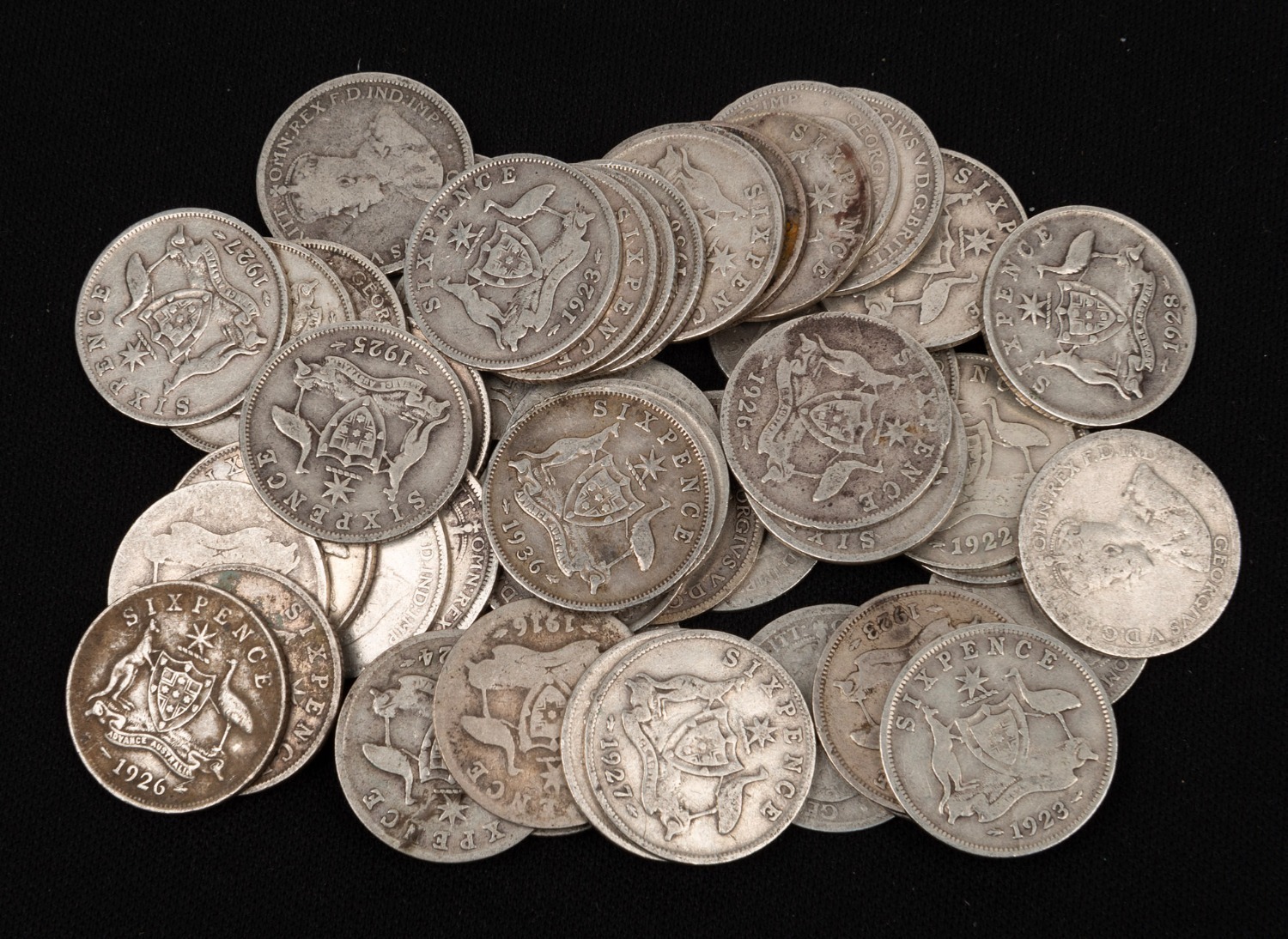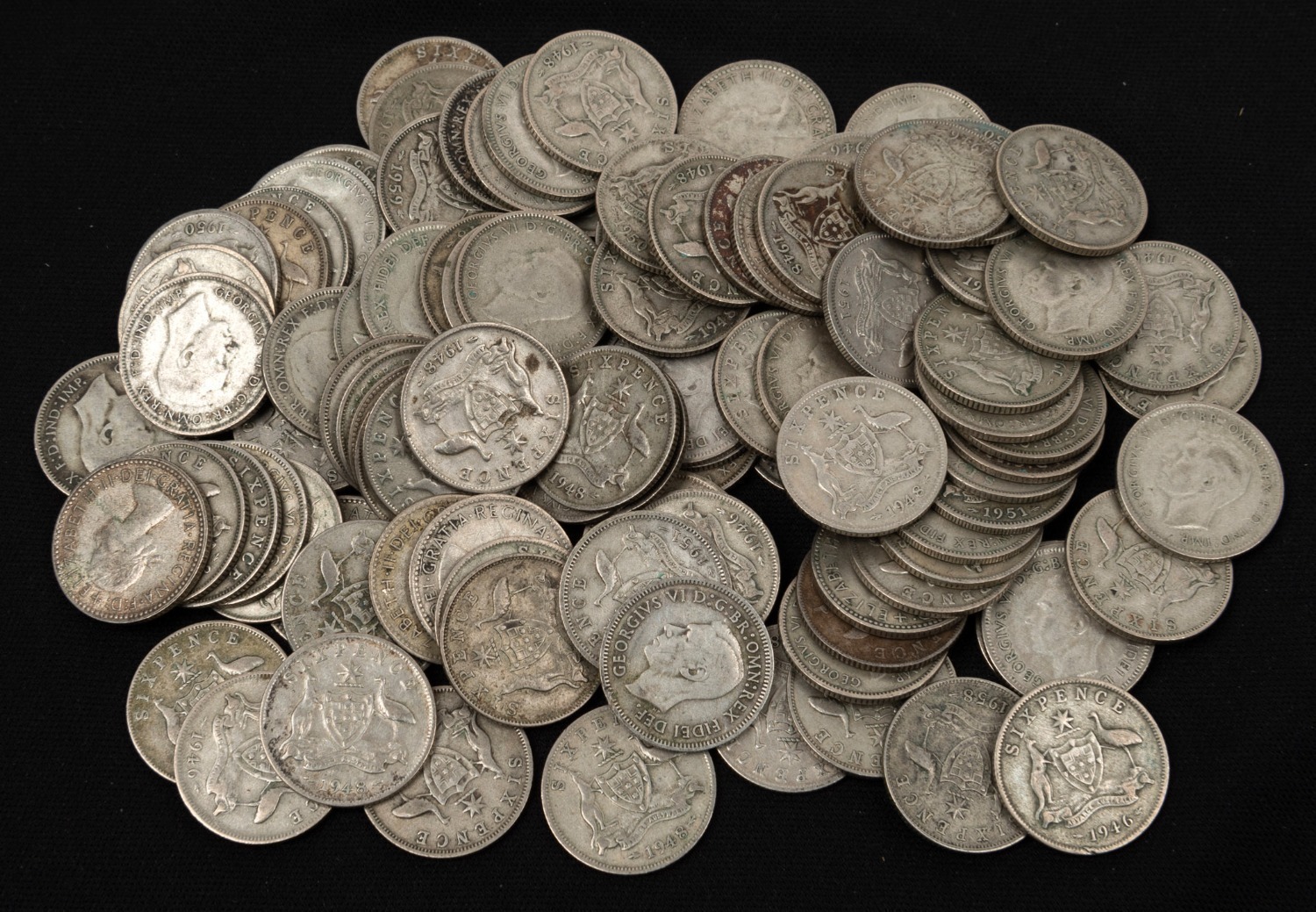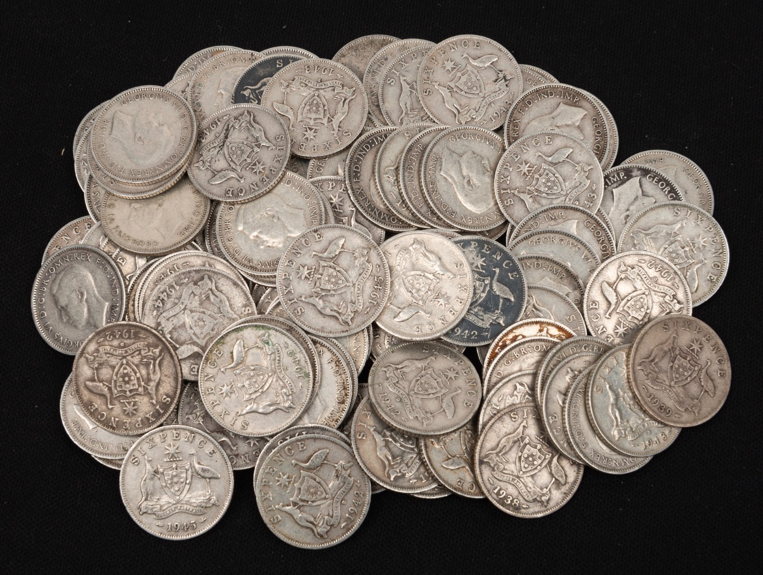 SIXPENCES: George VI, 1938 (6), 1939 (2), 1940 (4), 1941 (6), 1942 (11), 1942S (8), 1942D (22), 1943S (9), 1943D (11), 1944 (6)