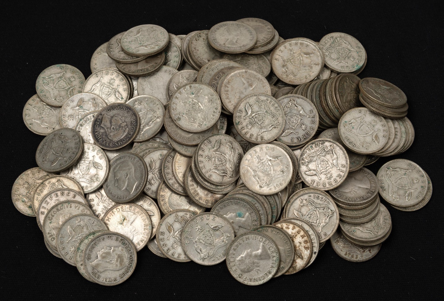 SIXPENCES: George VI, 1946 - 1951 (86), and Elizabeth II dates 1953 - 1963 (17); mixed condition. (Total: 103). (Image 1)