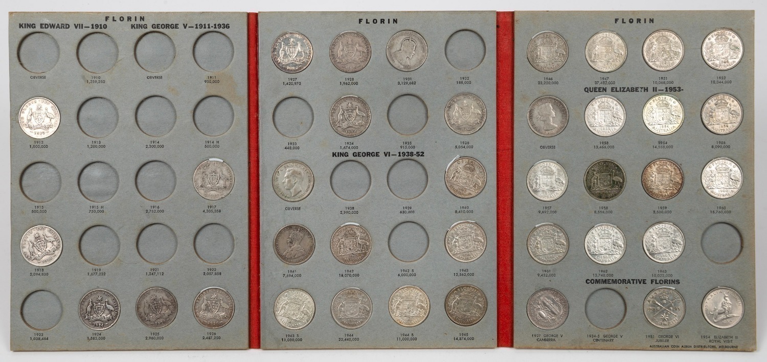 FLORINS: 1910 F, 1927 Canberra aUnc, 1934/35 Centenary VF, 1936 aUnc, 1942S Unc, 1943S VF, 1951 Jubilee aUnc, 1954 Royal Visit
