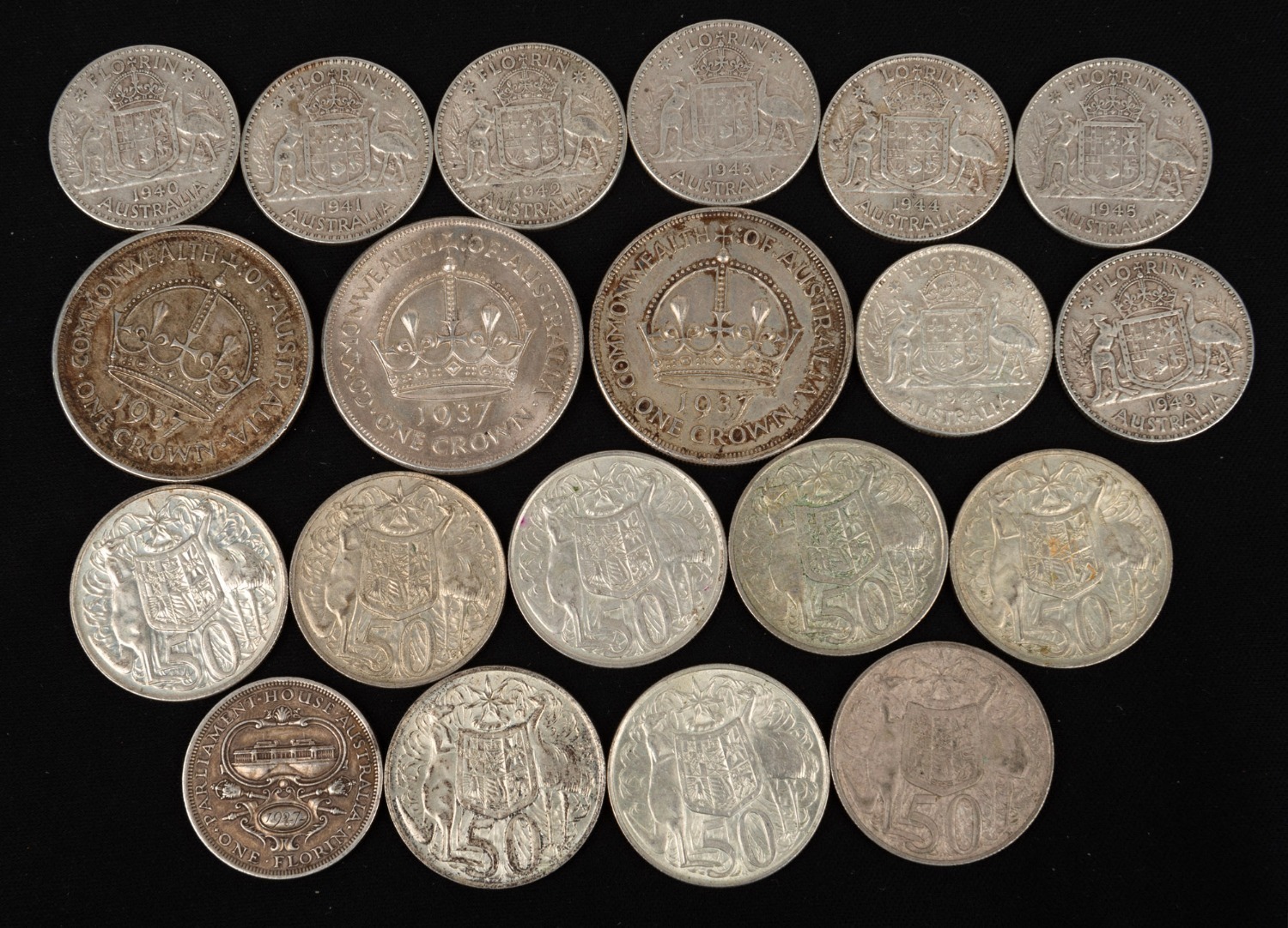 FLORINS: 1927, 1940, 1941, 1942 (2), 1943 (2), 1944 & 1945; plus 1937 Crowns (3) and 1966 50c (8); mixed condition. (Image 1)