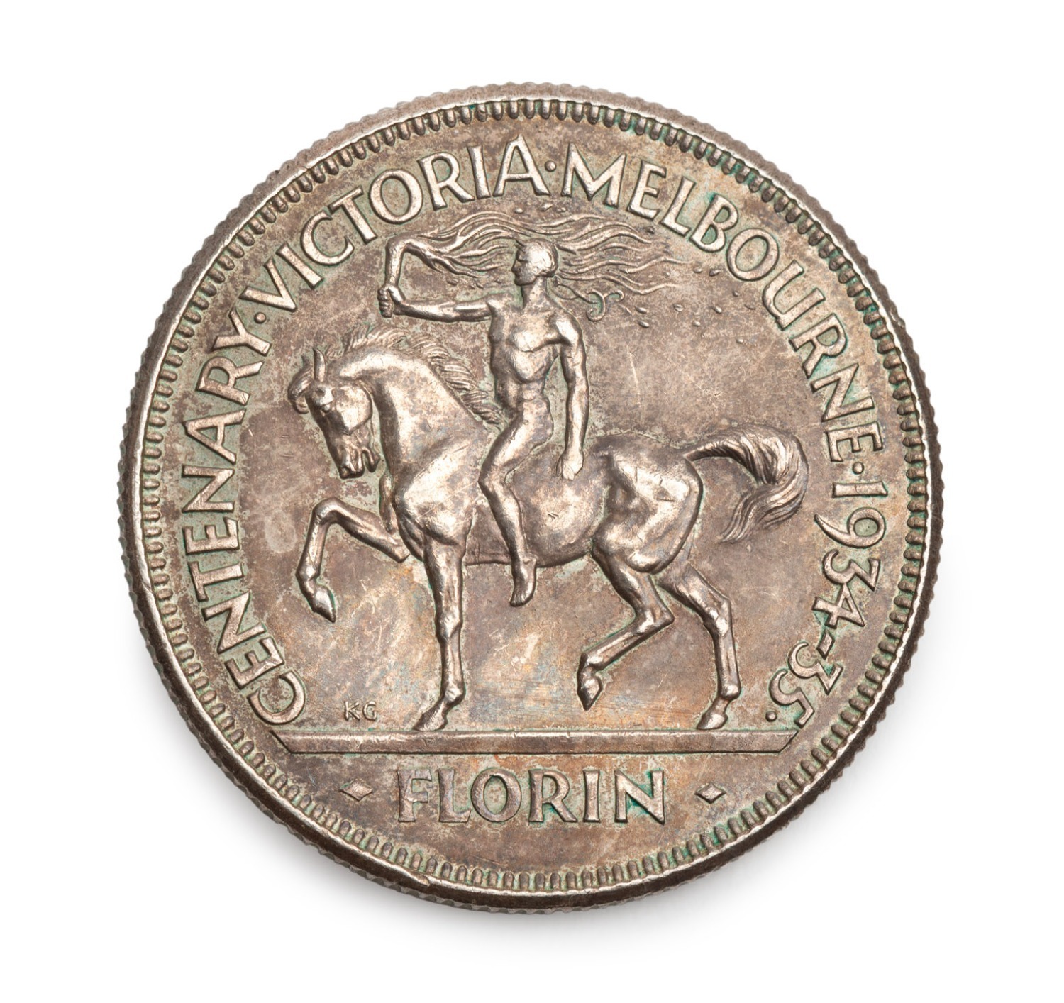 1934-35 Melbourne Centenary florin, toned EF. (Image 1)