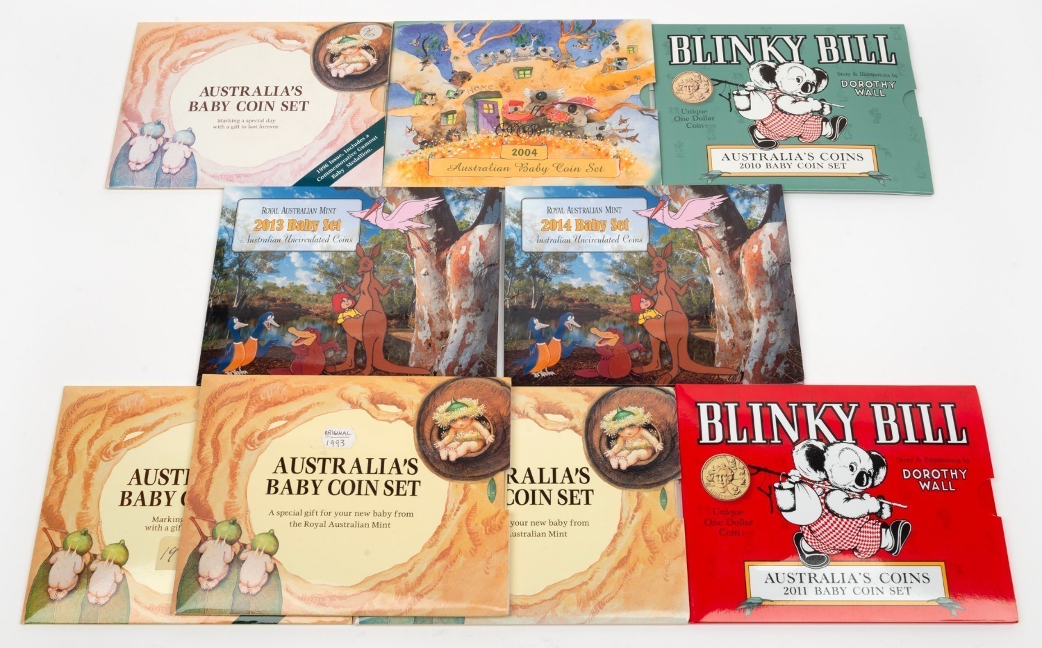Group of nine RAM uncirculated baby coin sets, comprising the years 1993 (x2), 1995, 1996, 2004, 2010, 2011, 2013, and 2014. (9