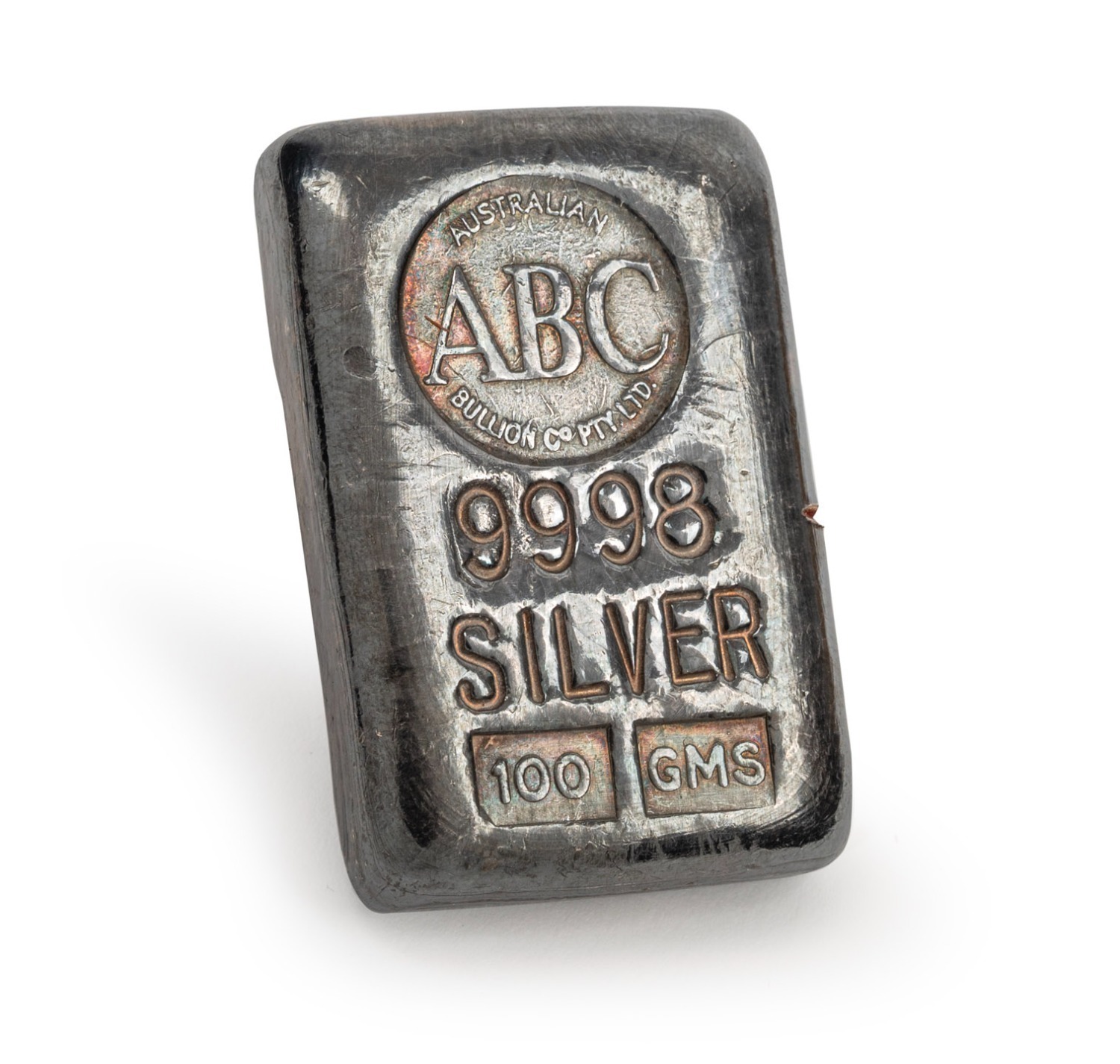 SILVER BULLION: 100gms ABC silver ingot. (Image 1)