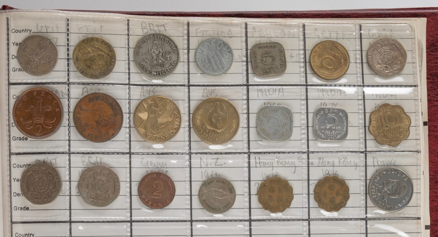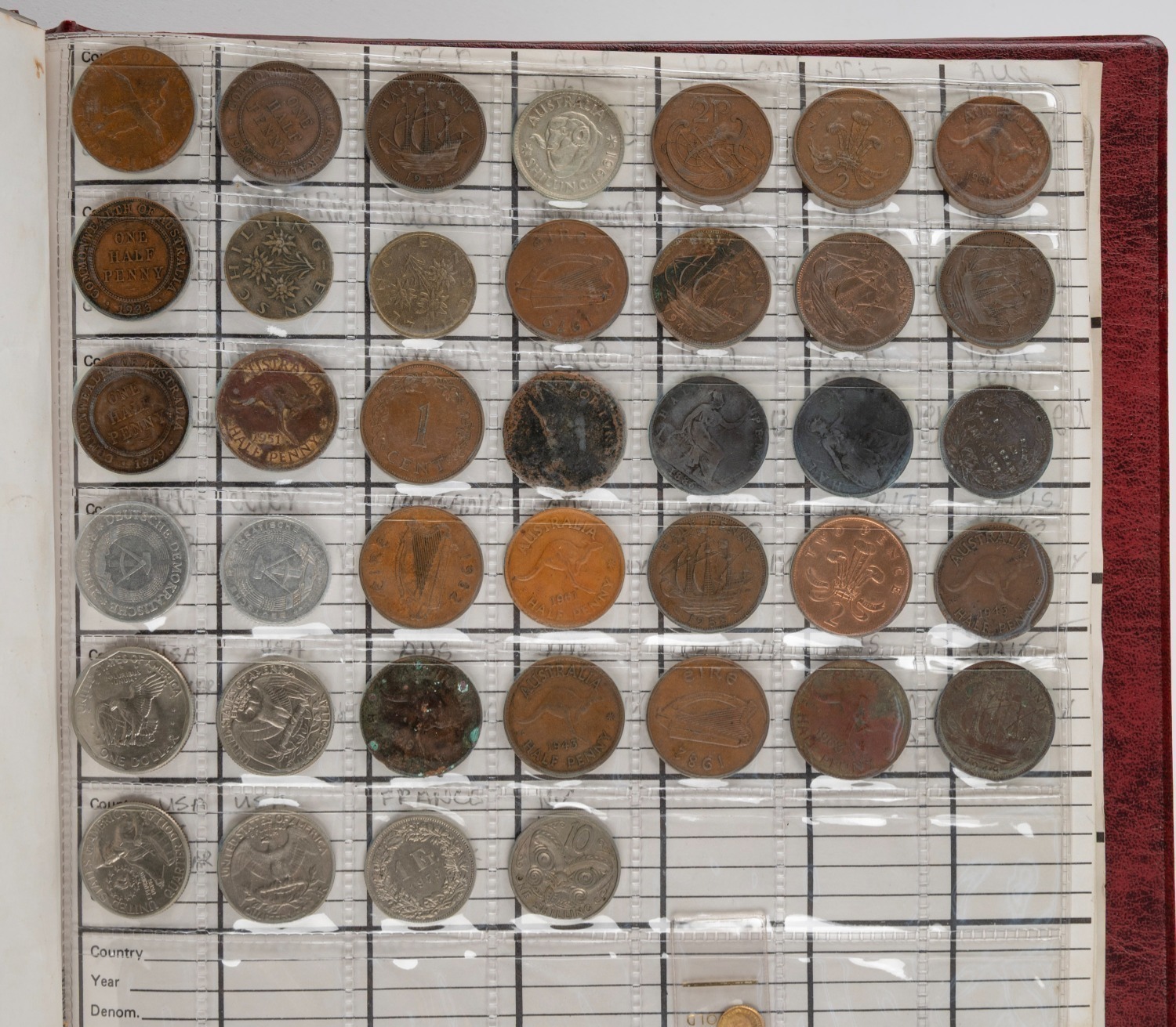 An Australia and all world accumulation in a large album. Noted a nice 1797 Cartwheel Twopence, several trade tokens, a miniature gold "sovereign", etc. (Image 1)