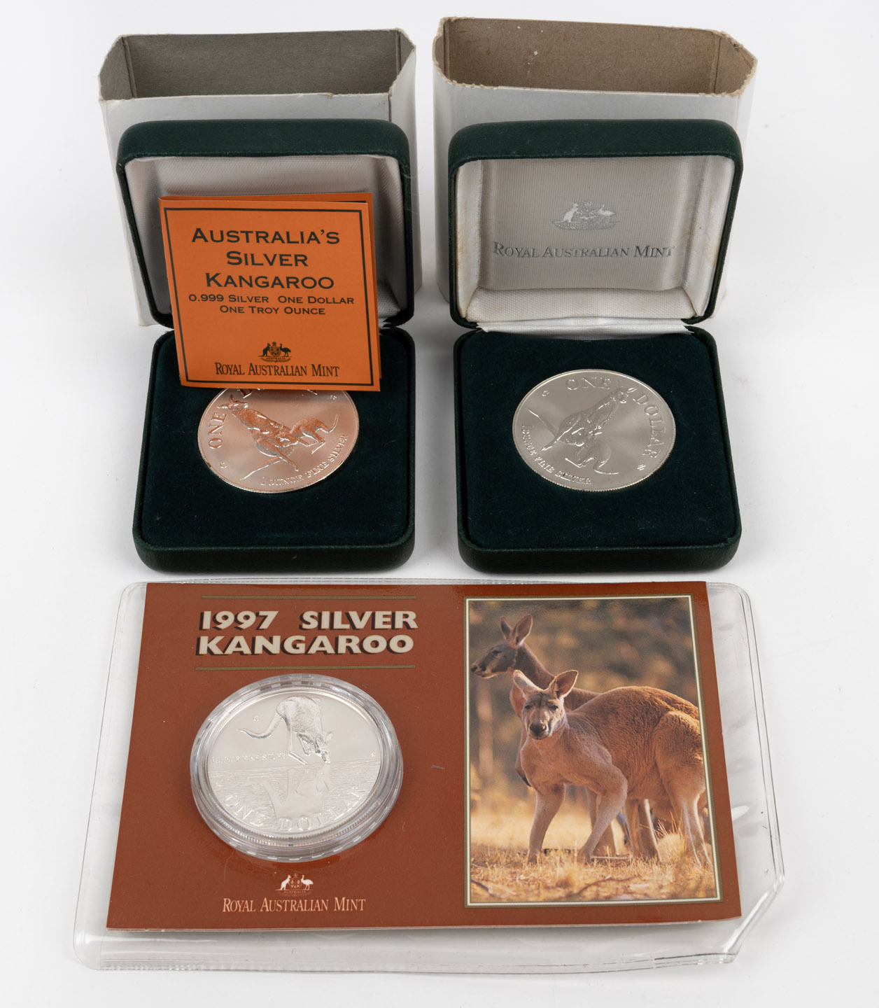 1996 RAM Kangaroos: $1 (1oz fine silver) coins, (2) in cases of issue; together with a 1997 $1 silver Kangaroo (1oz) carded. (3
