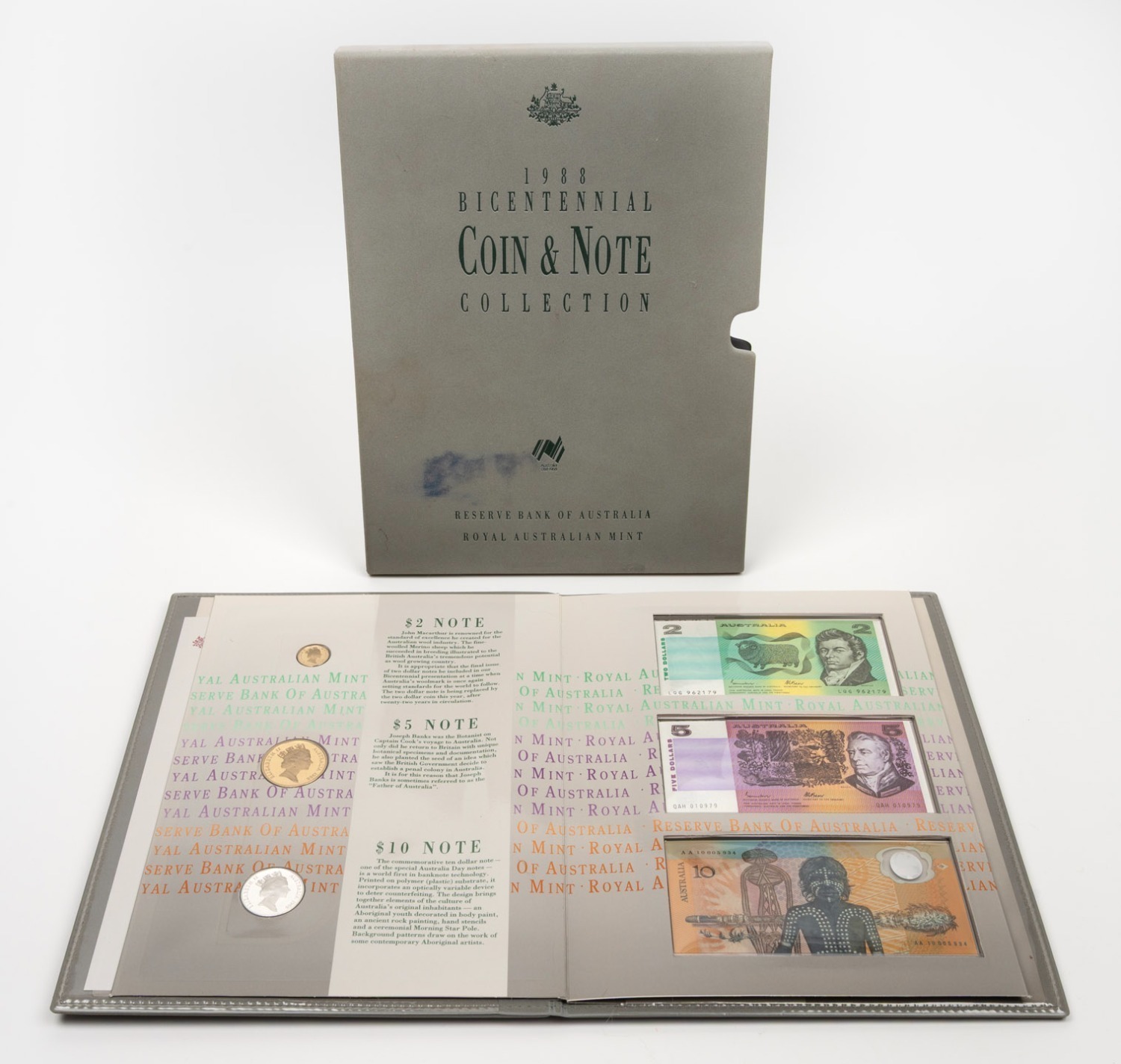 RAM 1988 Bicentennial Coin & Note Collection comprising $2/$5/$10 (sterling silver) coins, $2/$5 (paper), and $10