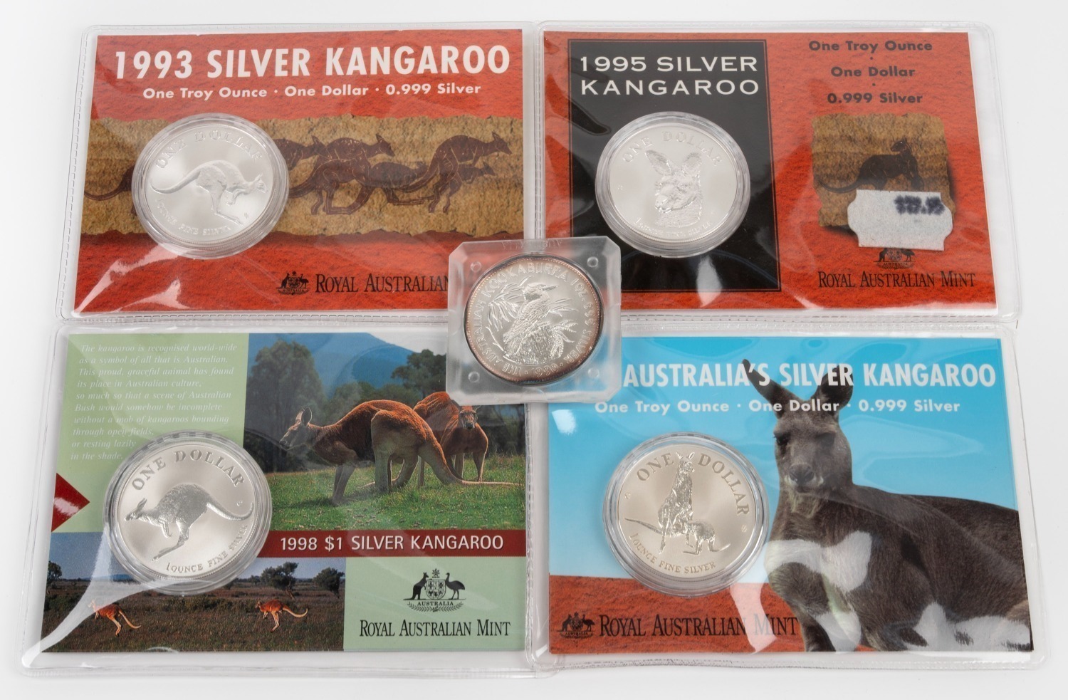 RAM SILVER KANGAROOS: Group comprising the 1993, 1995, 1996, and 1998 issues, all in original packaging, together with 1990 $5