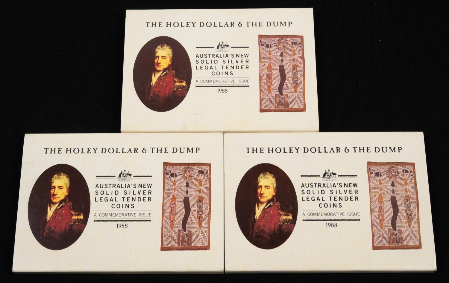 SILVER - THE HOLEY DOLLAR & THE DUMP: Three 1988 commemorative sets, each comprising 1oz Holey Dollar and 1/4oz Dump, all in