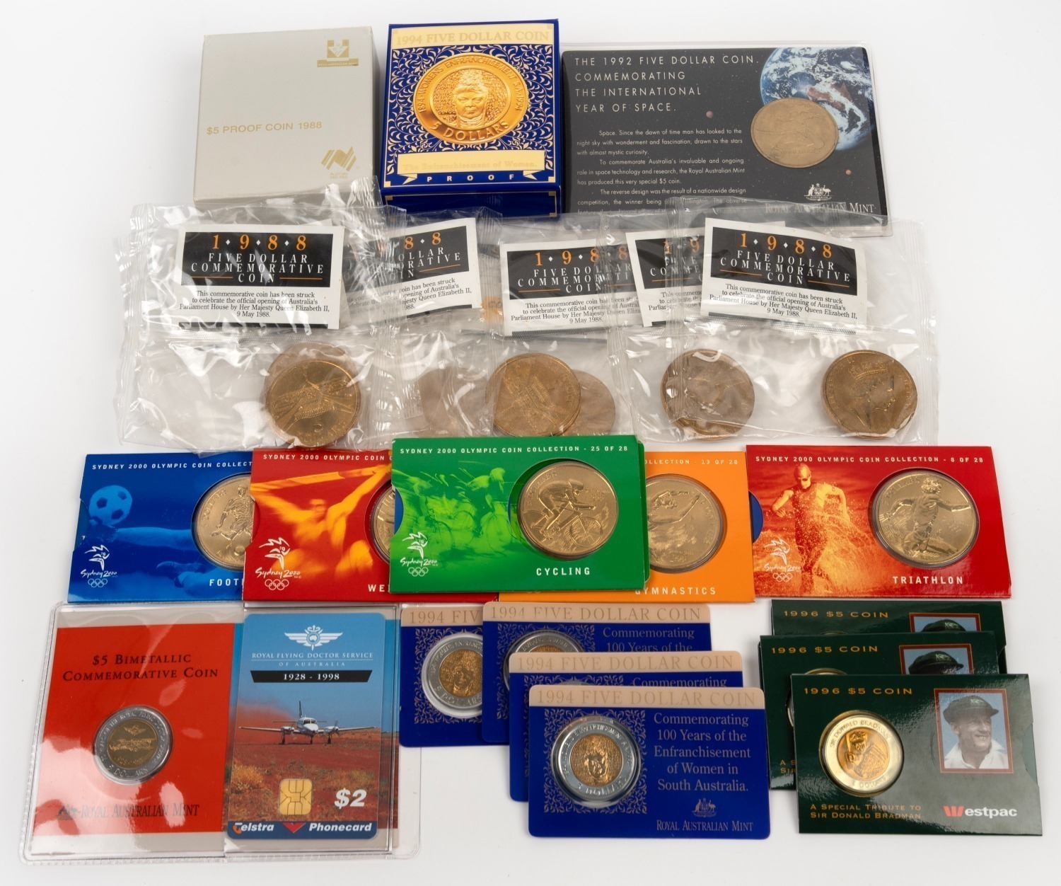 Group of RAM uncirculated $5 coins, all in presentation cases with box and CoA, comprising 1994 "Enfranchisement of Women", 1996 "Sir Donald Bradman", 1998 proof "Royal Flying Doctor Service" (2), 2000 proof