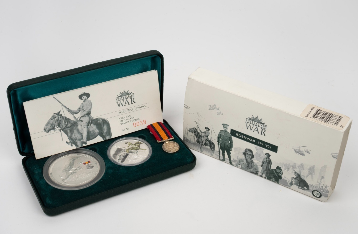 BOER WAR: 2003 Perth Mint commemorative set comprising 2oz silver coin, 1oz silver medallion, and miniature replica Queen's