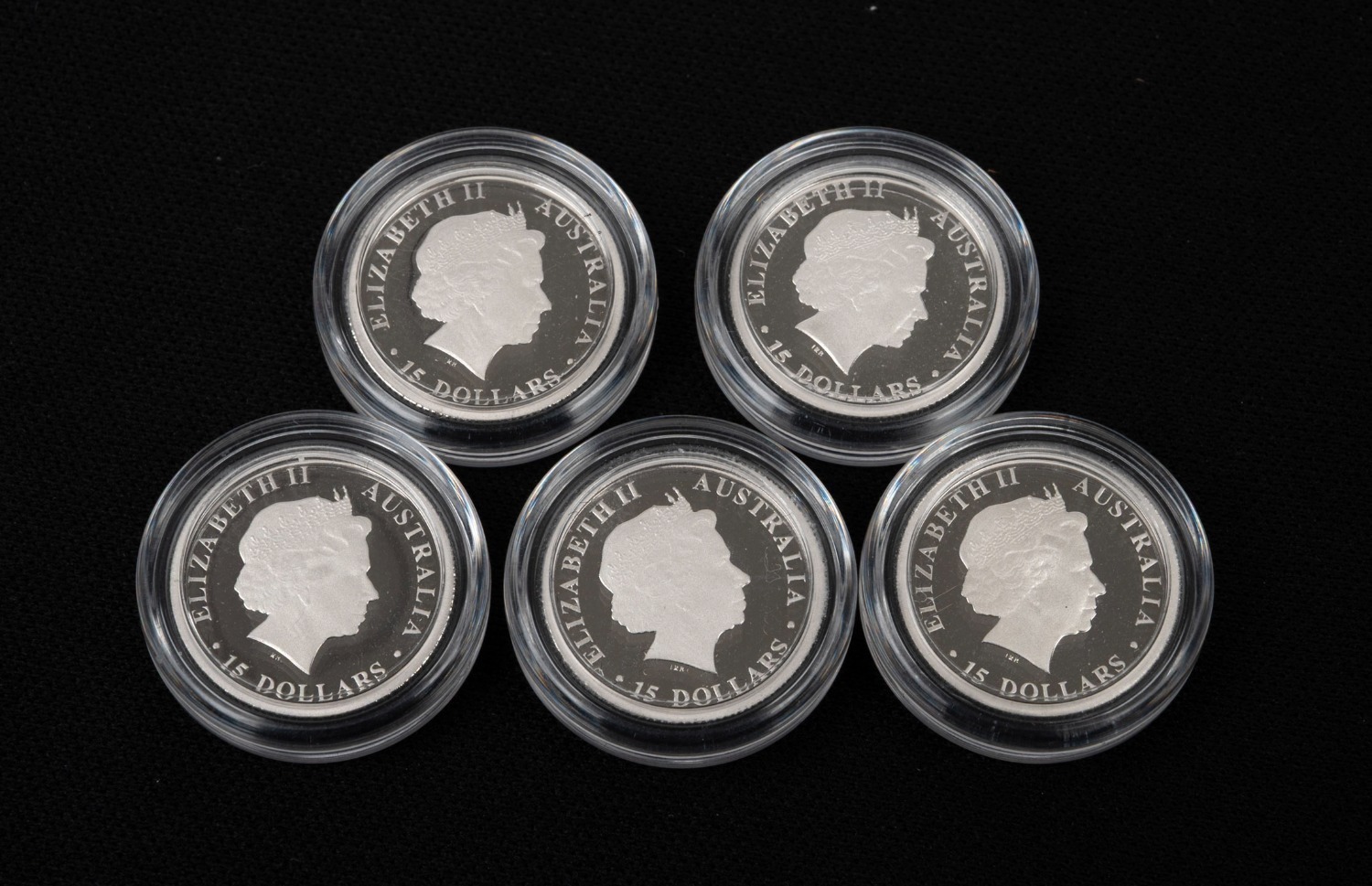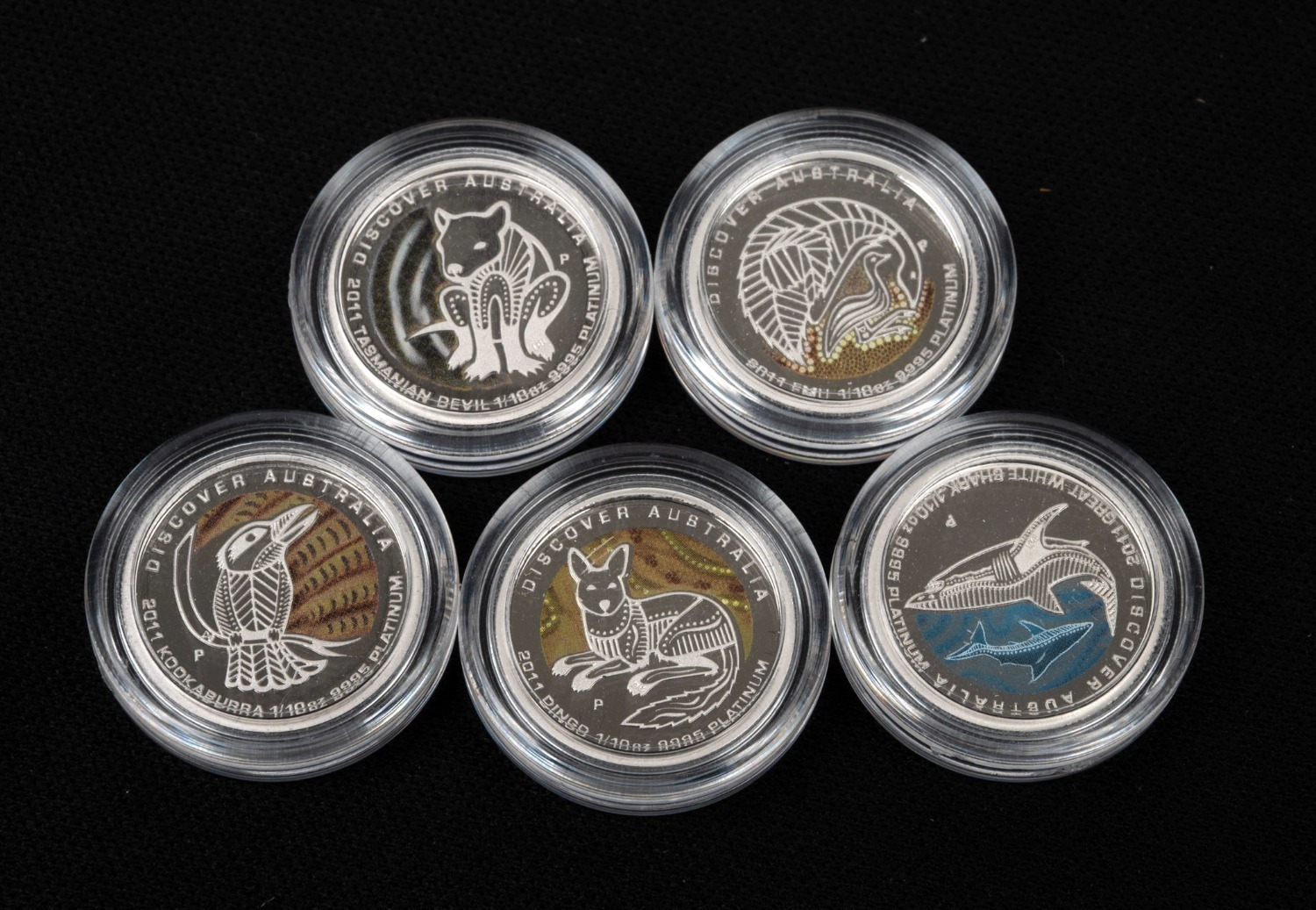 DISCOVER AUSTRALIA - PLATINUM: Perth Mint 2011 complete set of five $15 1/10oz coloured platinum proofs, comprising Dingo, Emu,