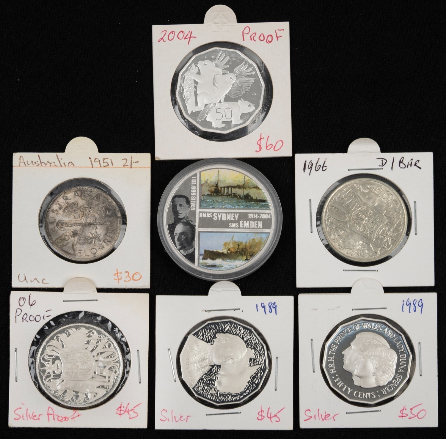 Group of silver coins comprising 1951 florin, 1966 round 50c (double bar), 1989 Captain Cook 50c, 1989 Prince of Wales & Lady