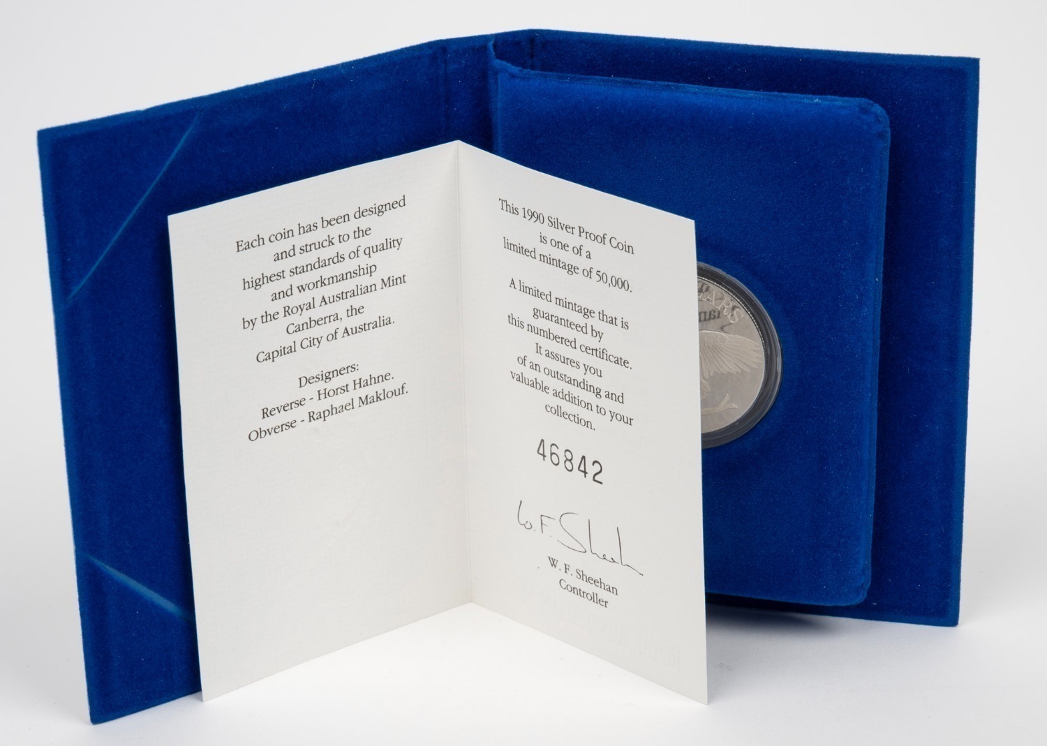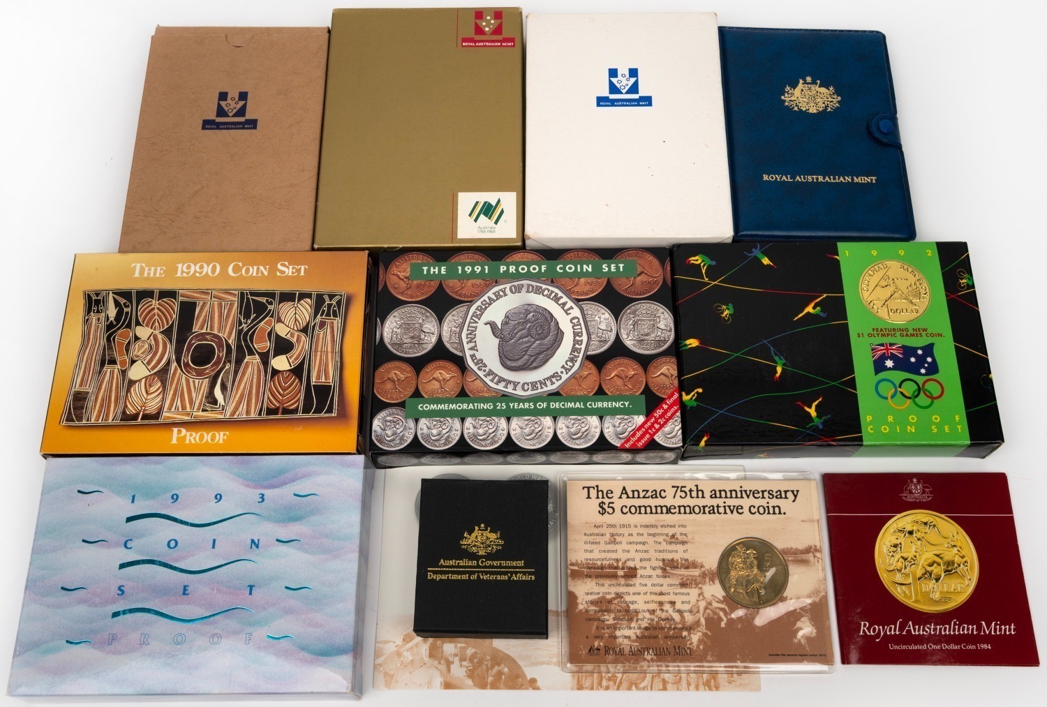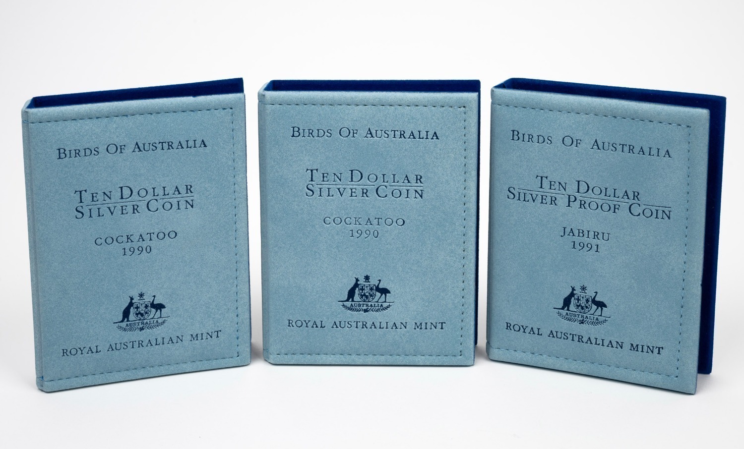 comprising 1989 Kookaburra, 1990 Cockatoo, 1991 Jabiru, 1992 Emperor Penguin, 1993 Palm Cockatoo (box lid absent), and 1994 Wedge-Tailed Eagle. (6 items) (Image 1)