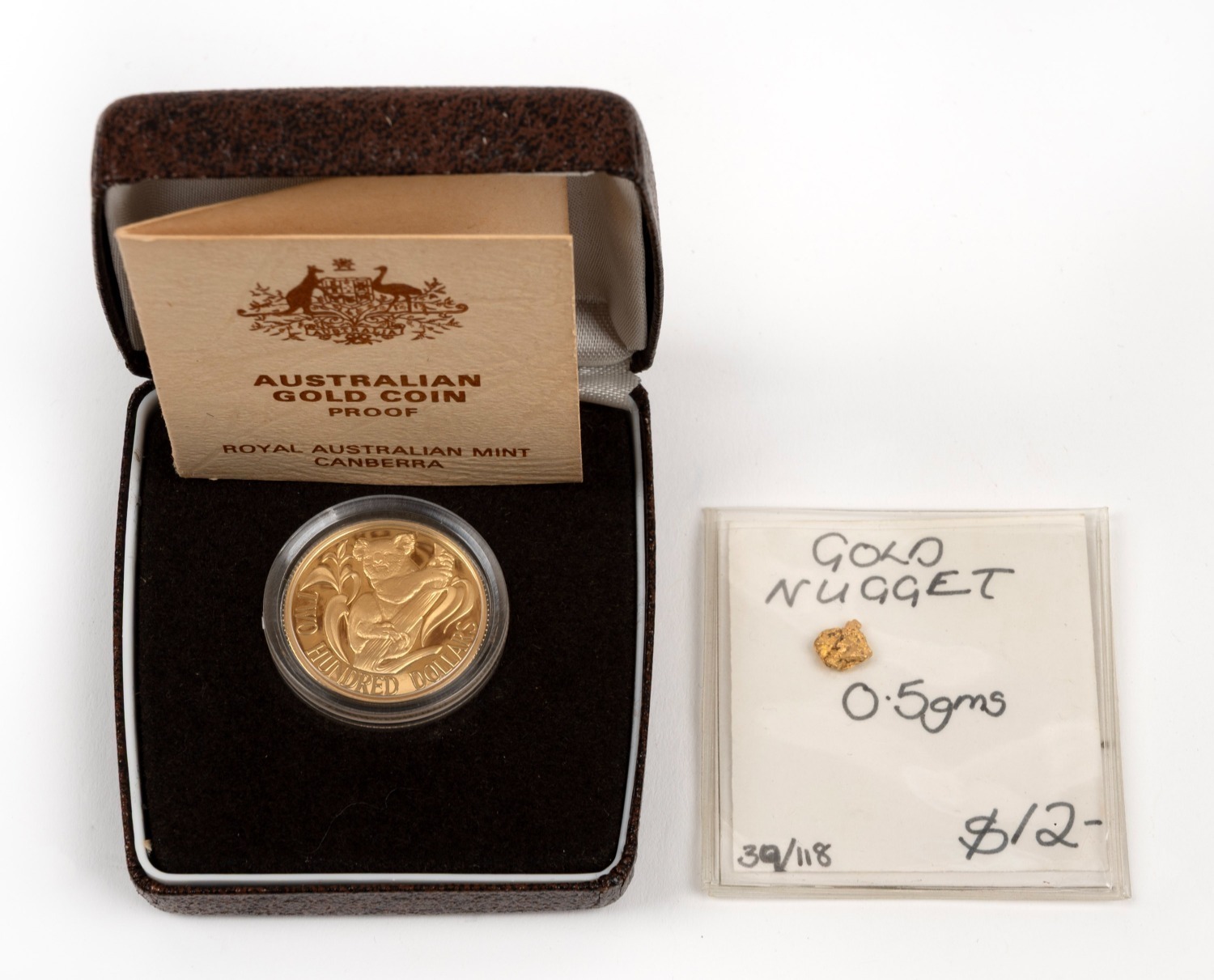 RAM GOLD PROOF: 1985 $200 Koala (10g, 22ct), in presentation case with CoA, together with 0.46g gold nugget. (Image 1)