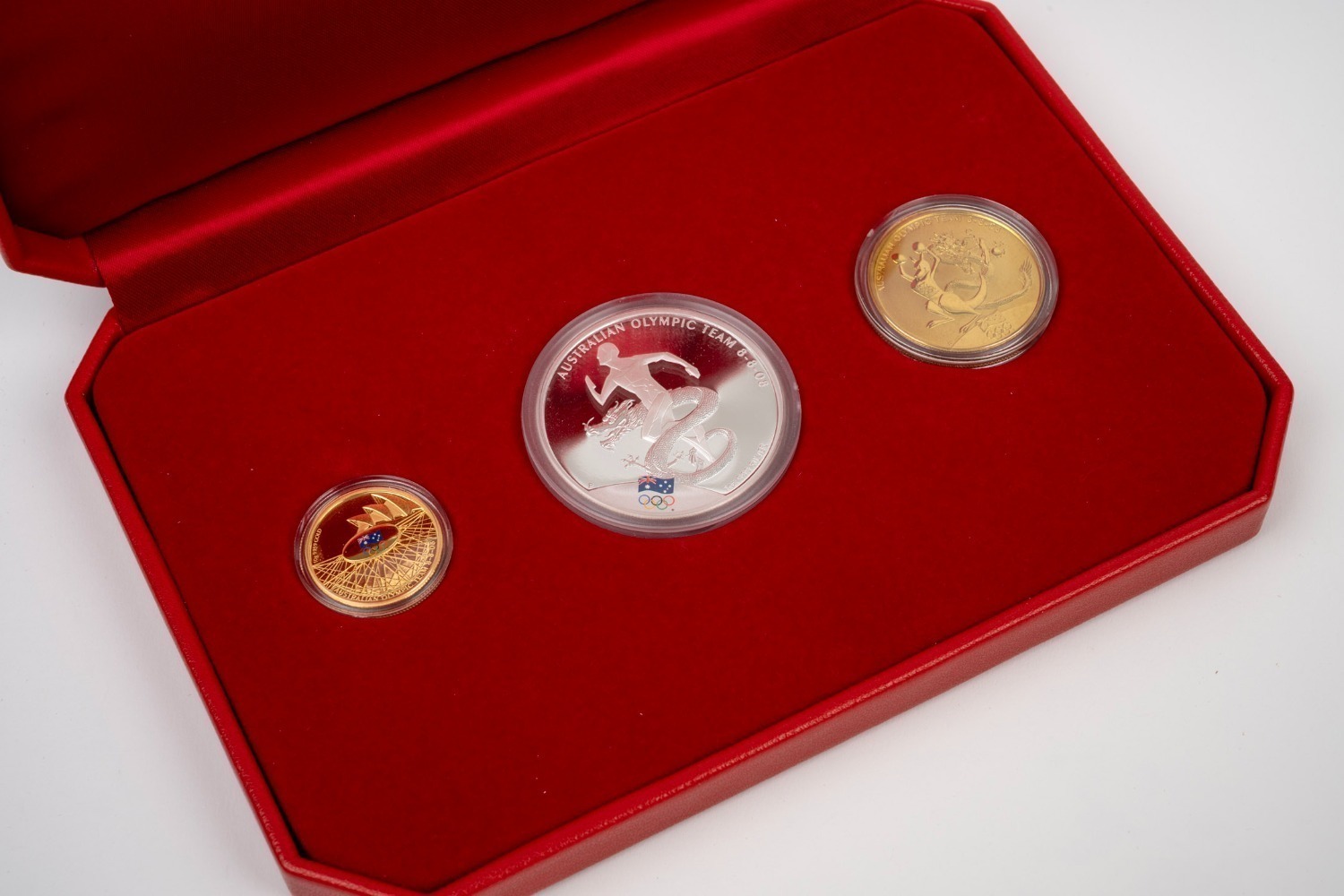 2008 AUSTRALIAN OLYMPIC TEAM: Perth Mint three-coin proof set, limited edition #563/888, comprising 0.322oz gold $60, 1oz silver