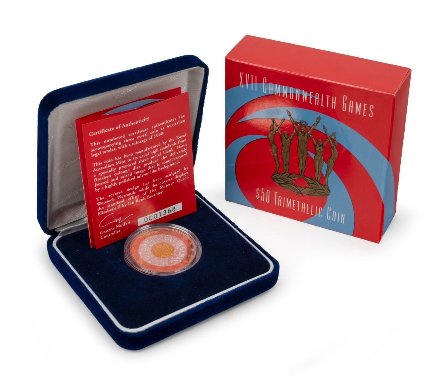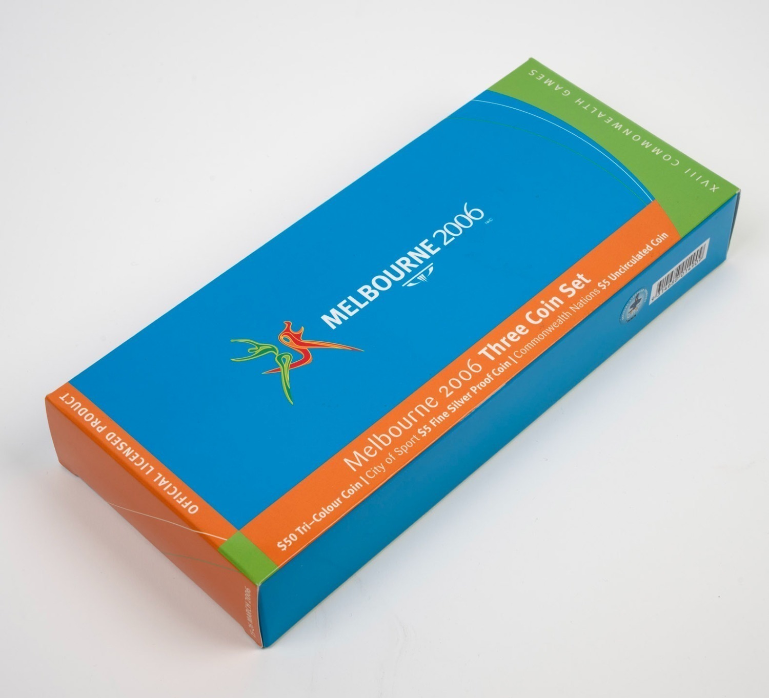 MELBOURNE 2006 COMMONWEALTH GAMES: RAM proof set comprising $50 trimetallic, $5 silver, and $5 uncirculated coins; offered in