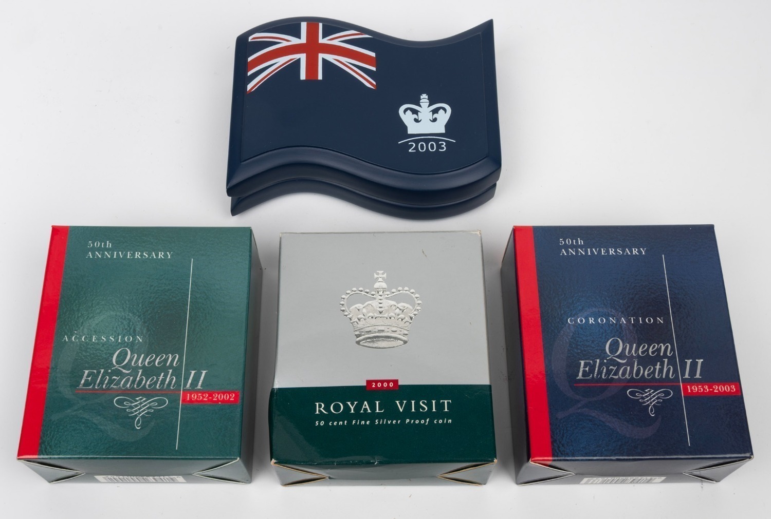 Visit", 2002 "QEII Accession 50th Anniversary", and 2003 "QEII Coronation 50th Anniversary", plus Perth Mint 2003 $1 "Golden Jubilee Of Coronation". (4 items) (Image 1)