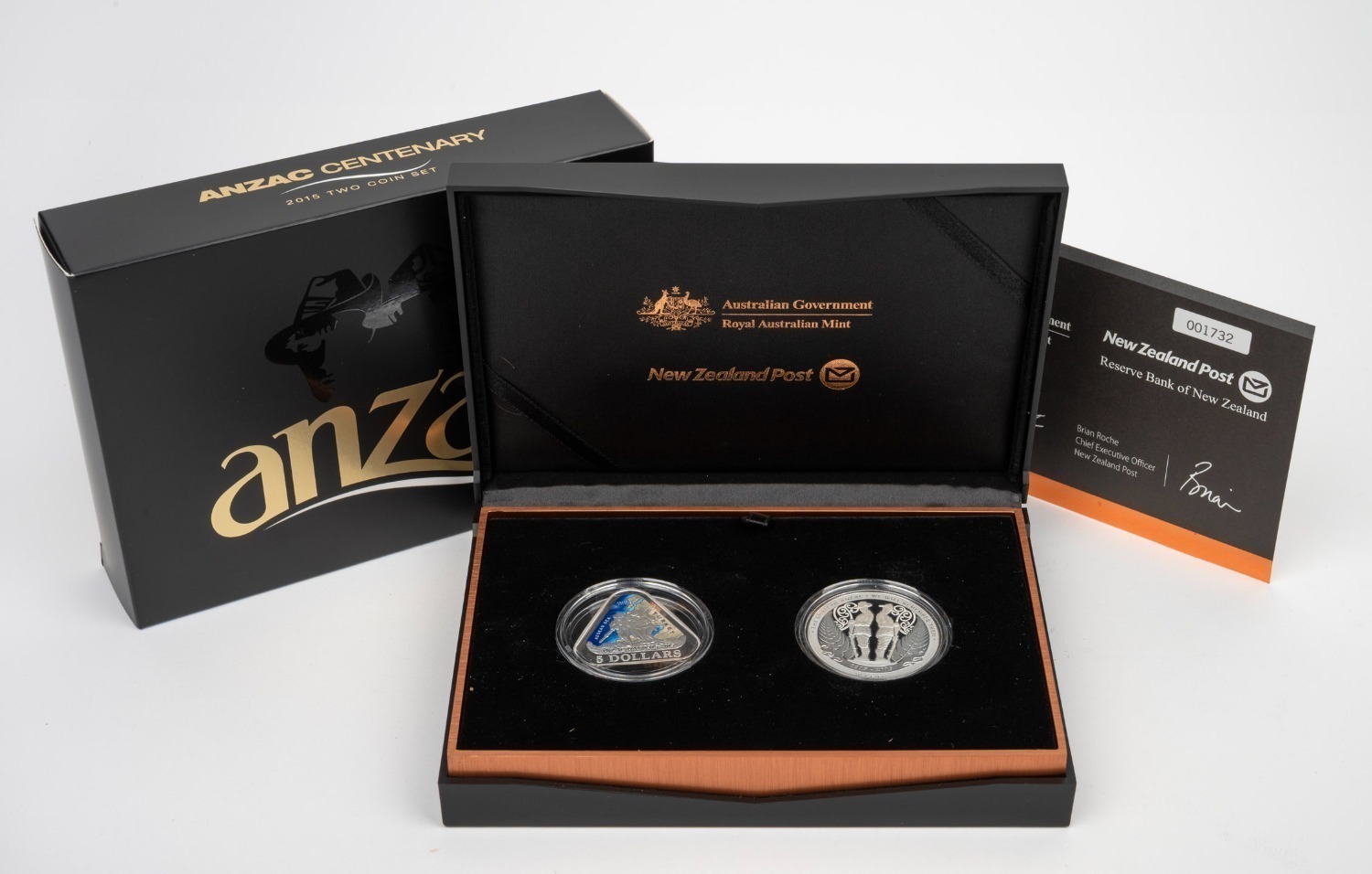 ANZAC CENTENARY: 2015 RAM/New Zealand Post joint issue two-coin proof set, comprising triangular 22.23g silver Australian $5 coin