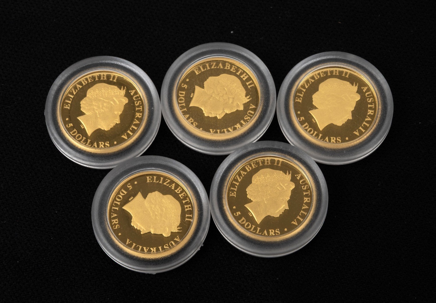 DISCOVER AUSTRALIA: Perth Mint 2011 complete set of five $5 1/25oz gold proofs, comprising Dingo, Emu, Great White Shark,