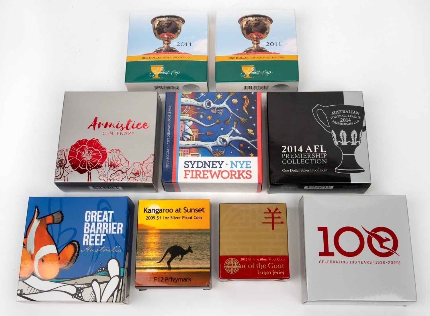 Sunset, 2011 Presidents Cup (coloured and uncoloured), 2014 Sydney NYE Fireworks (holographic), 2014 AFL Premiership, 2015 Great Barrier Reef (coloured), 2015 Year of the Goat, 2018 Armistice Centenary, and 2020 Qantas 100 Years. (Image 1)