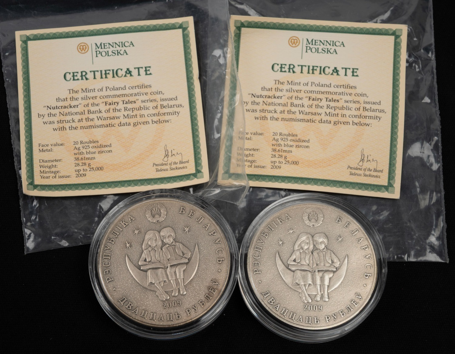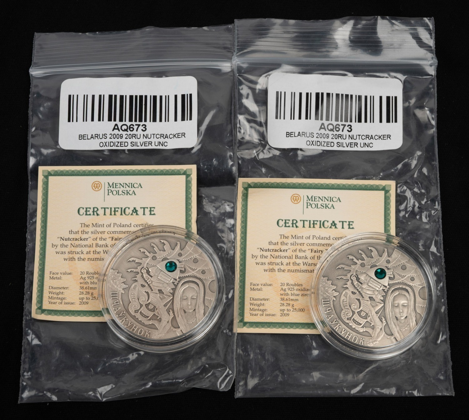 BELARUS - THE NUTCRACKER: Two 2009 "Fairy Tales" 20 ruble coins, each 28.28g sterling silver, antiqued finish with
