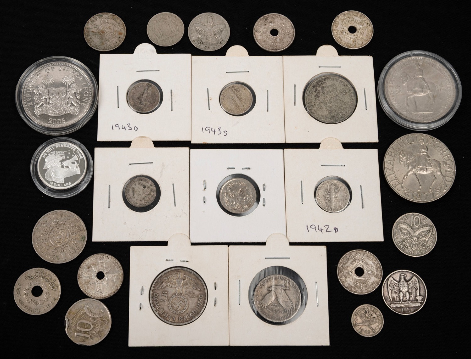 An accumulation of twenty-five world coins, mostly silver, from years dating 1925 to 2013; mixed condition. (25 items) (Image 1)