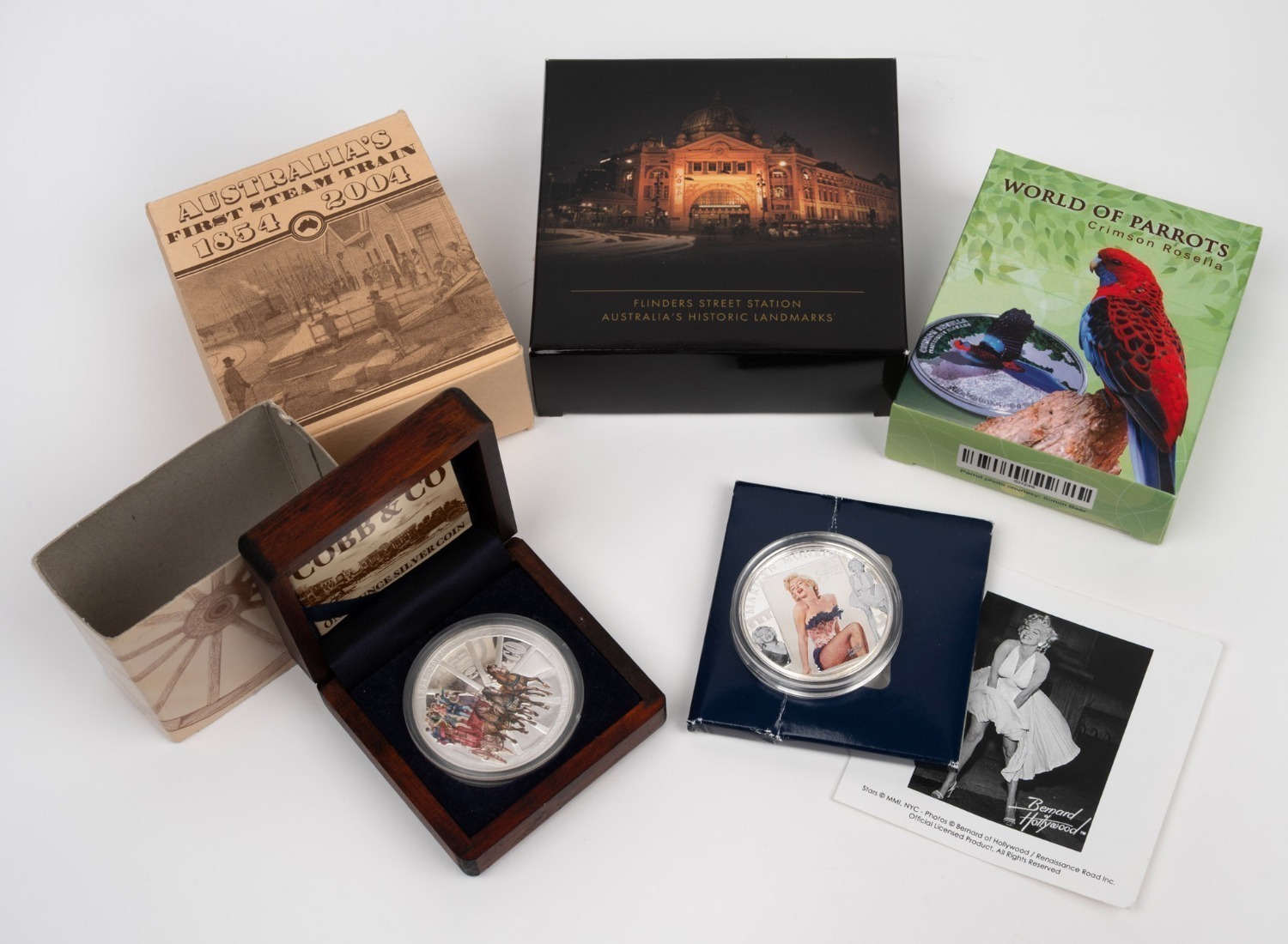 Marilyn Monroe (silver-plated $1), 2014 World Of Parrots (20g sterling $5), and 2015 Flinders Street Station (2oz $10 #33/999). (5). (Image