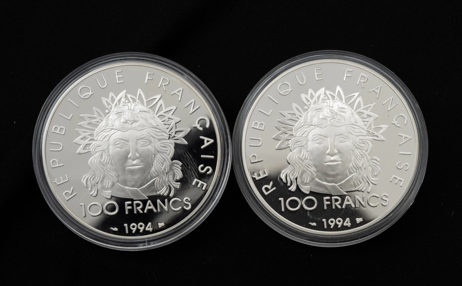 1994 100 Franc silver Proof pair produced for the IOC Centennial 1896-1996 Series - Discus and Javelin, (2). (Image 1)