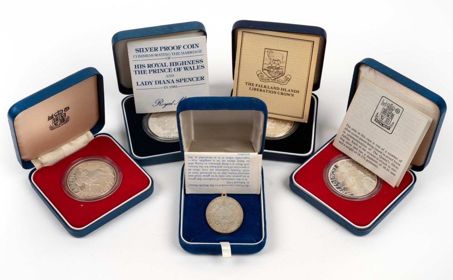 SILVER PROOFS: Group comprising 1977 Queen's Silver Jubilee Crown (2), 1981 Royal Marriage, 1982 Falkland Islands Liberation