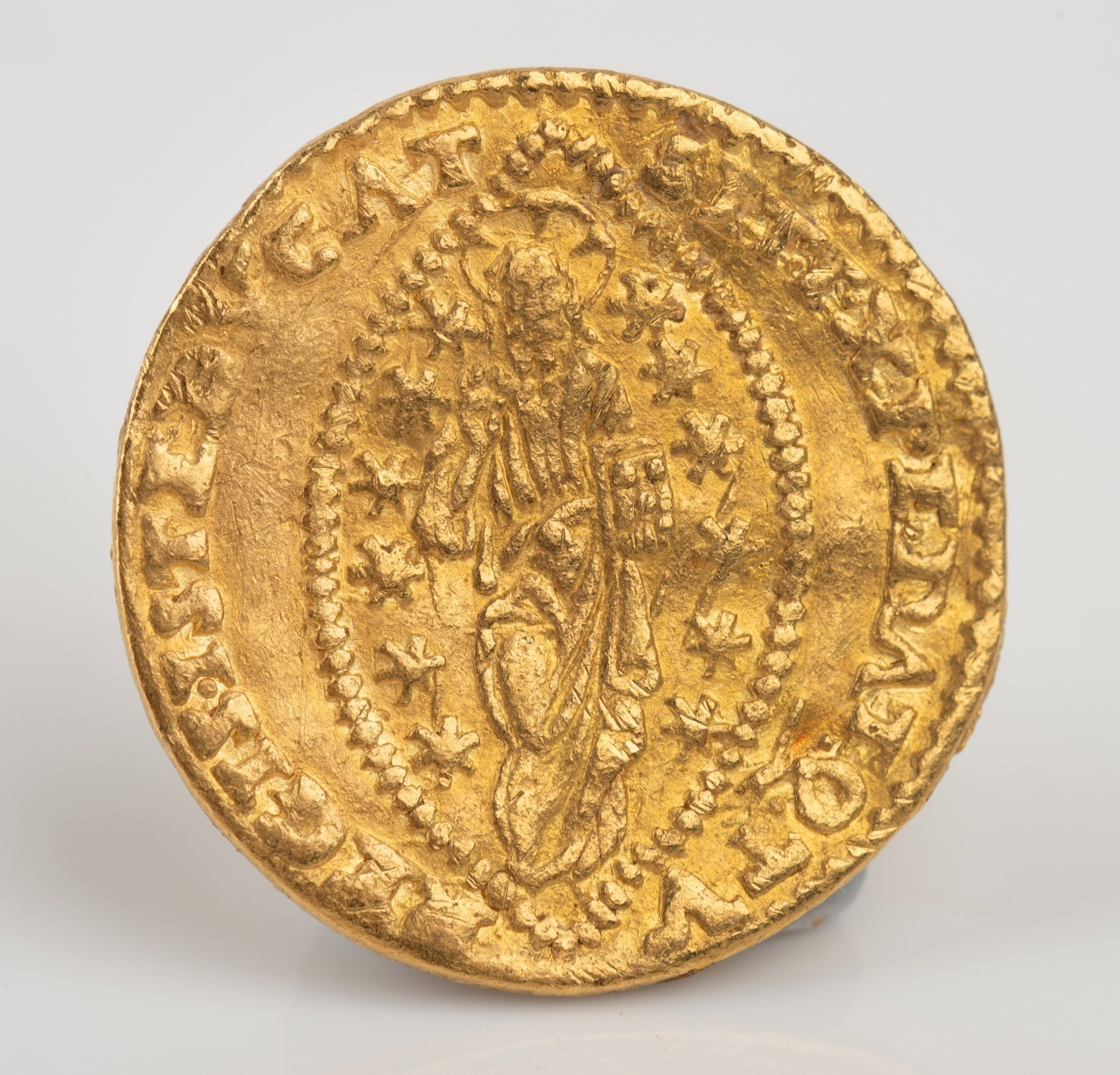 VENICE, Lorenzo Priuli (1556-1559), gold ducat or zecchino (3.46g, 21mm), obv. DUX LAVR PRIO S.M.VENET, doge kneeling before St
