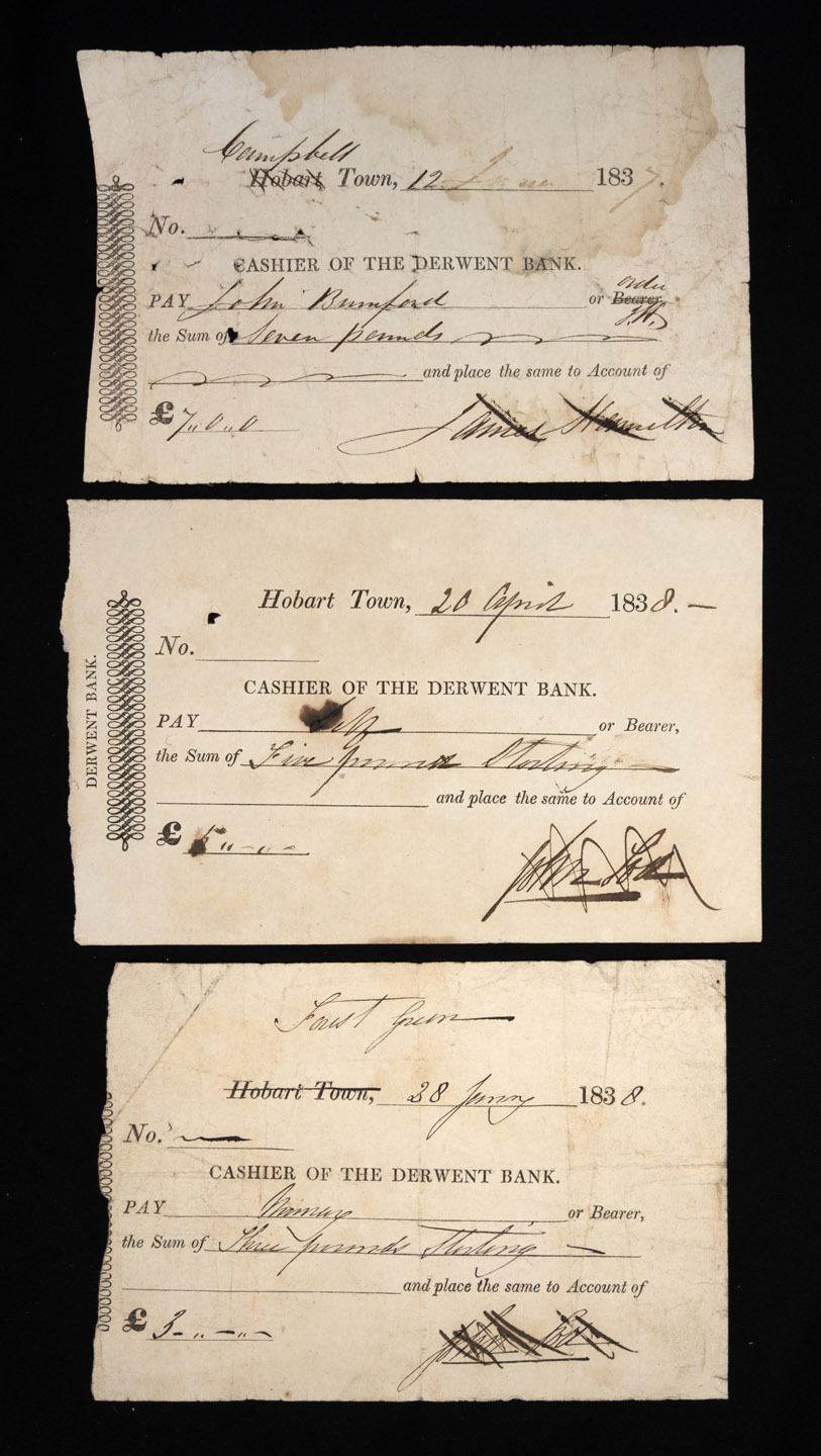 VAN DIEMEN'S LAND: DERWENT BANK CHEQUES: A group of three printed cashier's cheques completed in manuscript: June 1837 at