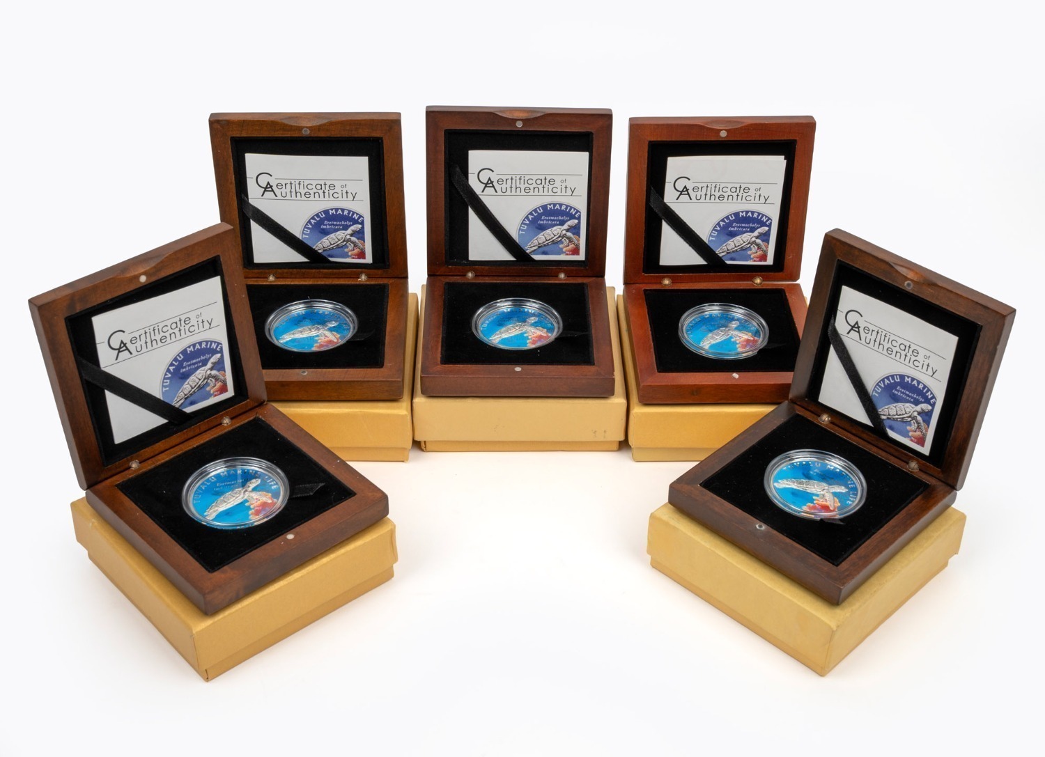 SILVER PROOFS - TUVALUAN MARINE LIFE: Group of five Tuvalu 2010 "Eretmochelys imbricata" $10 coloured coins, each 25g